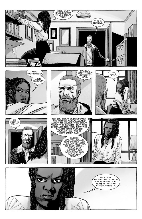 Dwight’s death may have just increased the amount of tension already brewing in the Commonwealth. Between that and Mercer’s plan to overthrow the current rule, you can see how another powder keg is ready to explode. Rick Grimes won’t be enough to stop this incoming insurrection. But let’s dive into issue #187: “Falling Into Place.”