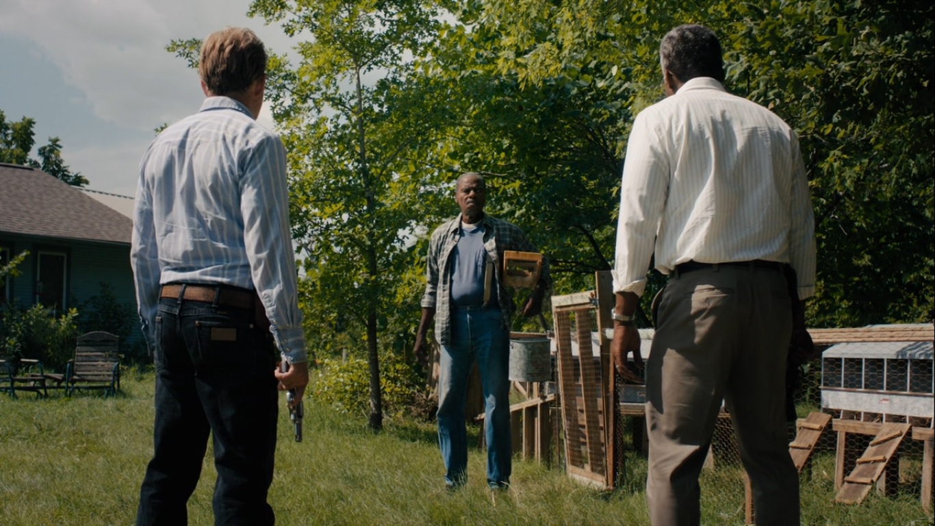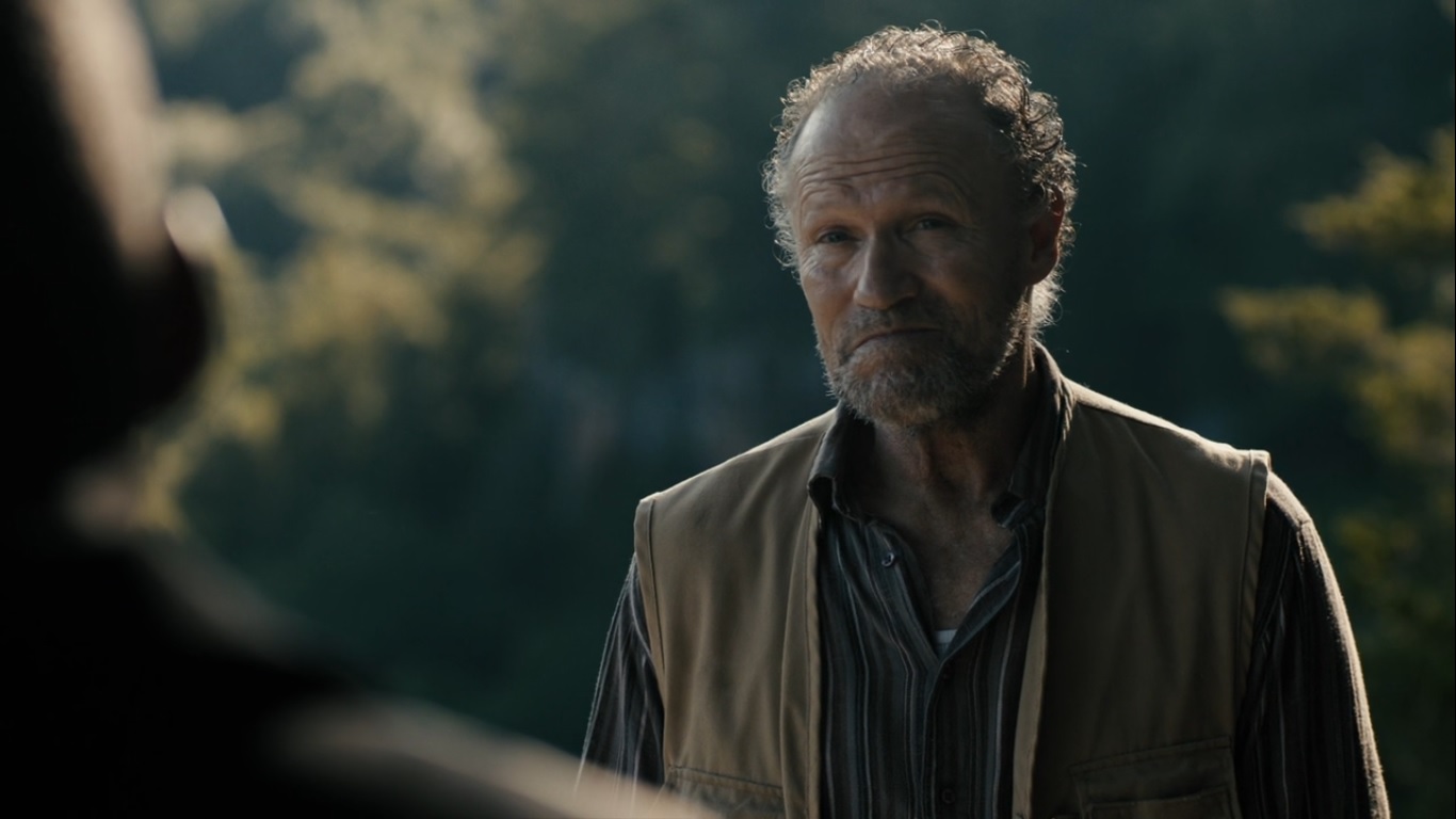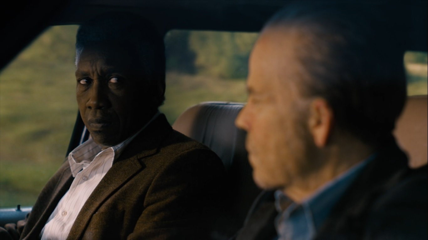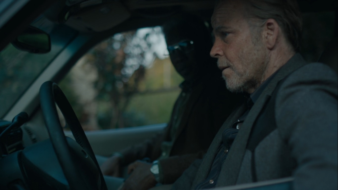Then we cut to Wayne in the car with Mr. Edward Hoyt, played by Michael Rooker, who takes Wayne through the backroads to resolve this situation, and Hoyt has his own military history from Korea. Hoyt tells Wayne that they’re both soldiers, and right now he wants to know what happened to Harris James. Wayne explains that he spoke with Harris a few days ago, but Hoyt sees through the bullshit.
