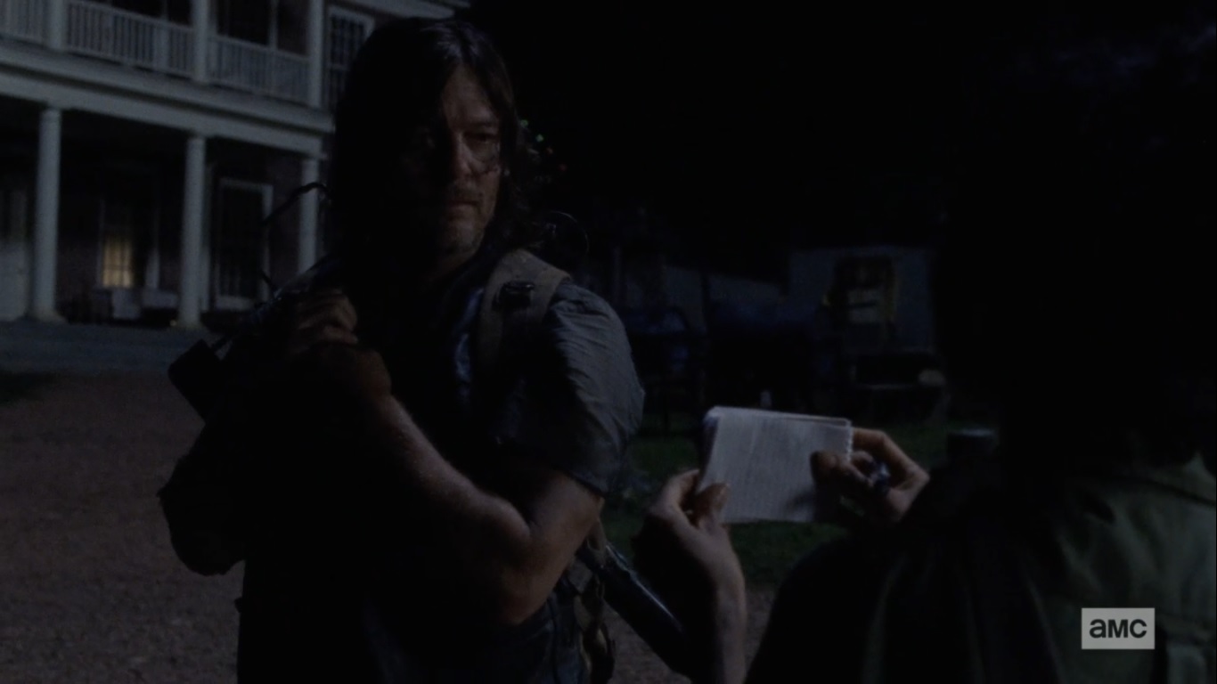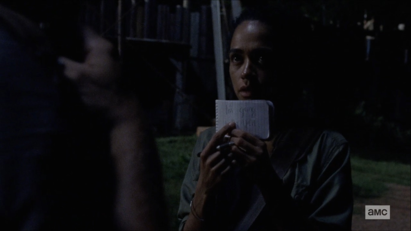 As Daryl keeps watch, Addy brings a note from Henry: he couldn’t live with what happened, so he’s going to find Lydia. As Daryl heads out, Connie stops him and writes a note to ask where he’s going. He shows Henry’s note and then she writes that she’s going with him. She can’t live with it either.