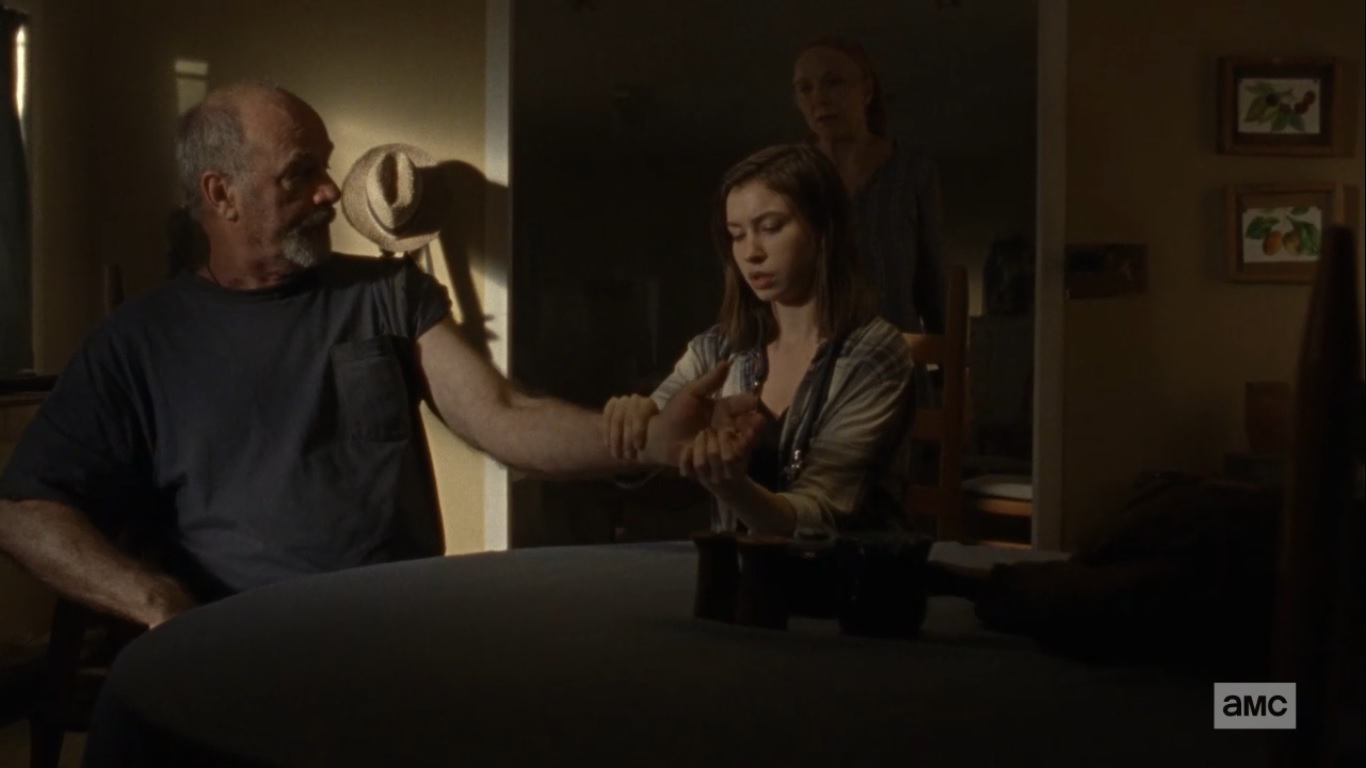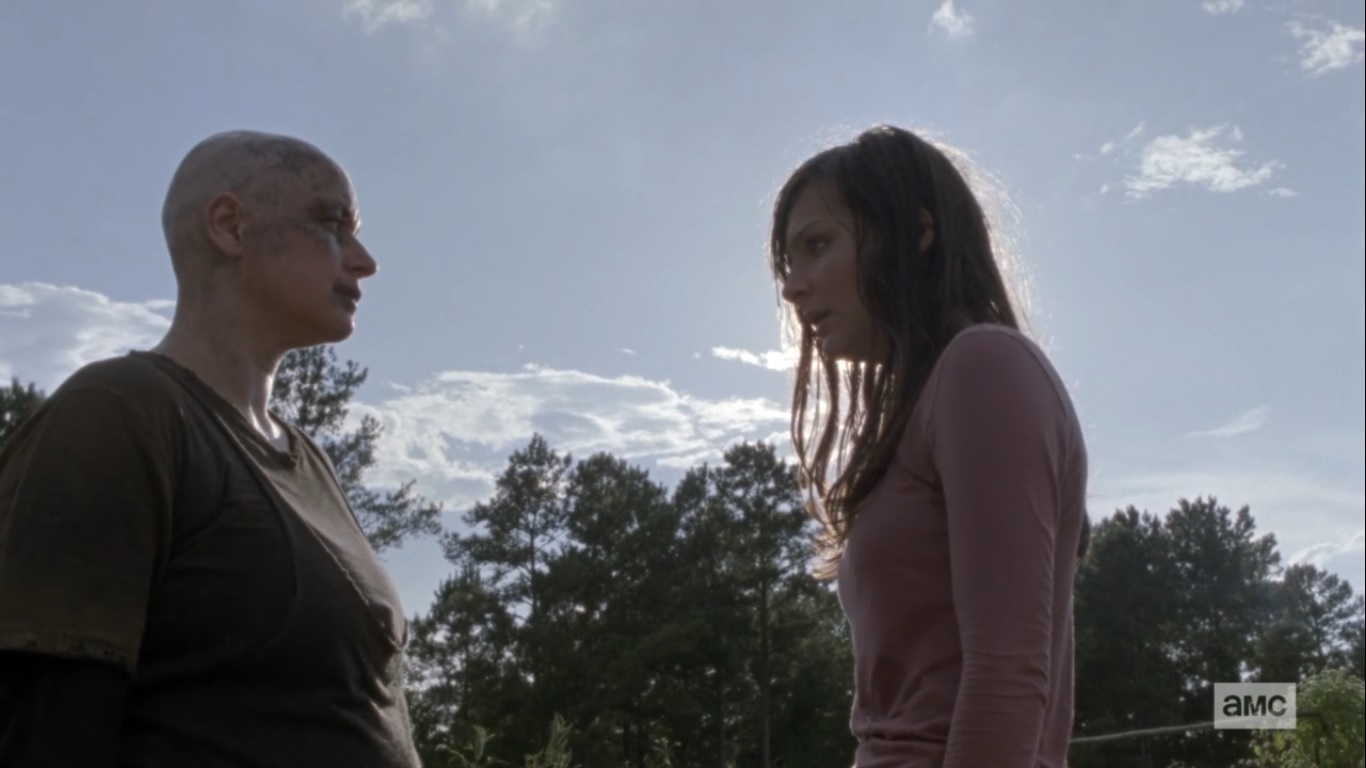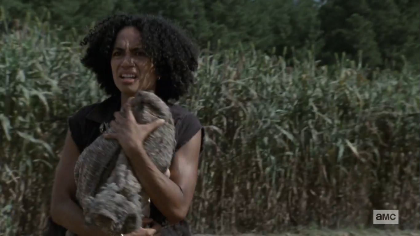 Of the newcomers in Magna’s group, it’s nice to see Connie stepping up so soon after her introduction. Her deafness may be somewhat of a handicap compared to those who can speak, but that does not hinder her in the slightest. She rescues the baby, even though these people are clearly her enemy, and she manages to fight off the walkers in the crops with no loss to her person.
