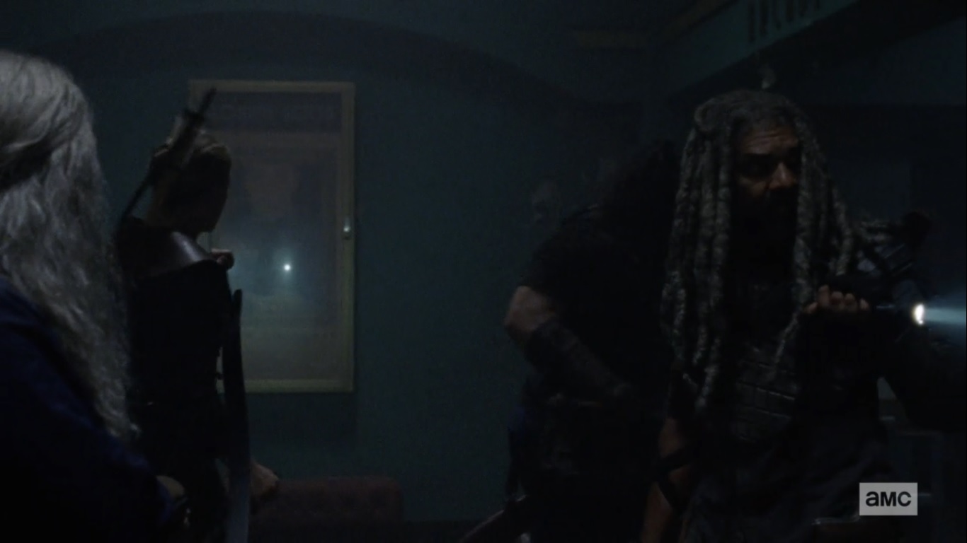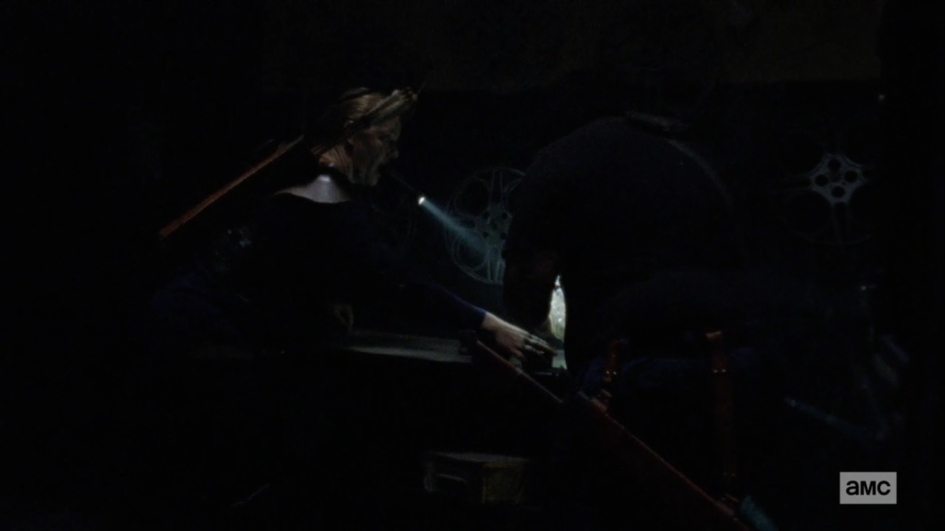 Back at the theater that time forgot, Jerry informs Ezekiel that he dropped the bulb amidst the walkers in the aisles. The herd will be back in minutes, and Ezekiel is now content with the poster. Well, it’s some form of victory. However, Carol says that they should stay behind to get the bulb. This time, she’s not doing it just for Ezekiel. So they get to work taking down the walkers.
