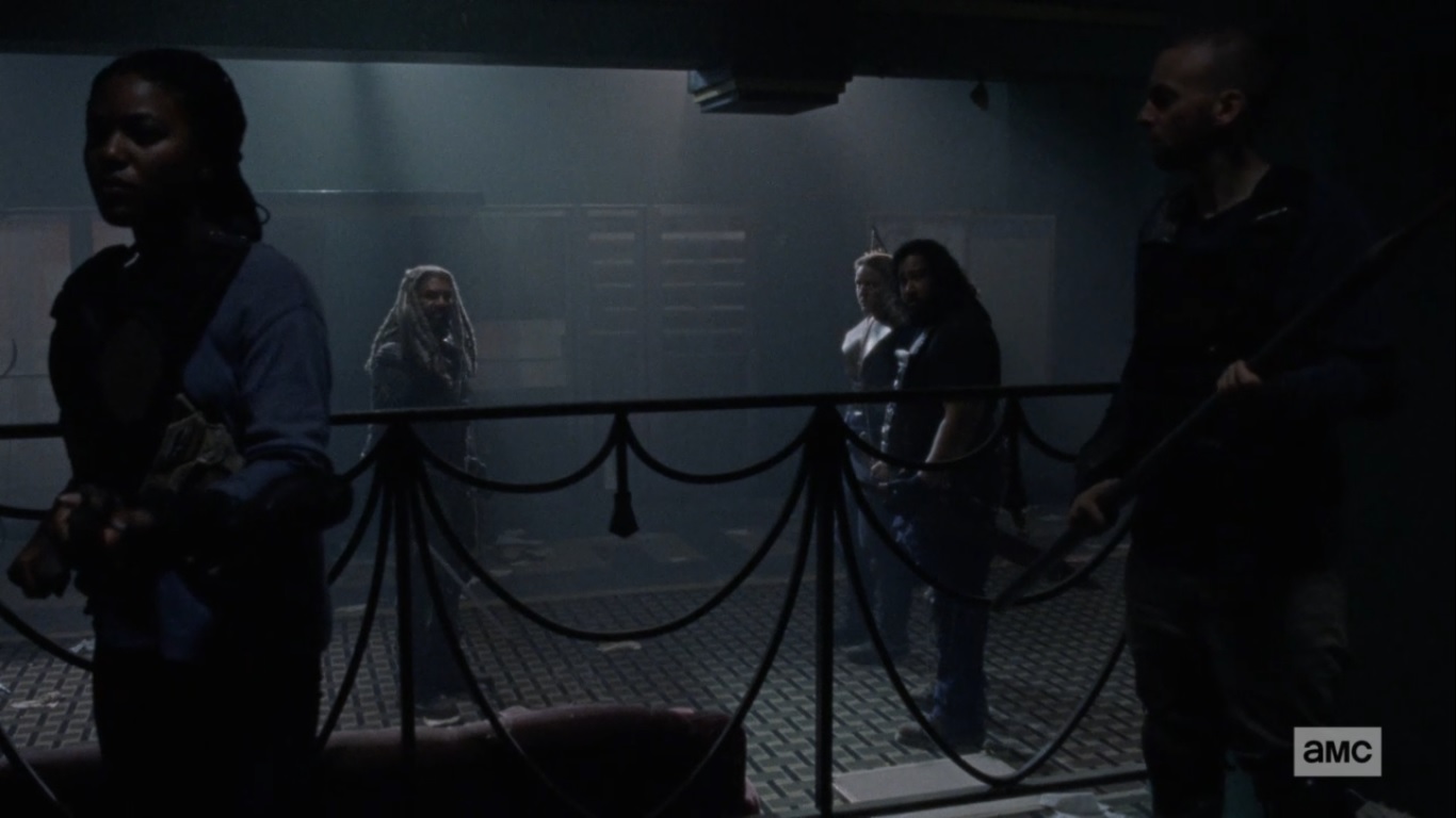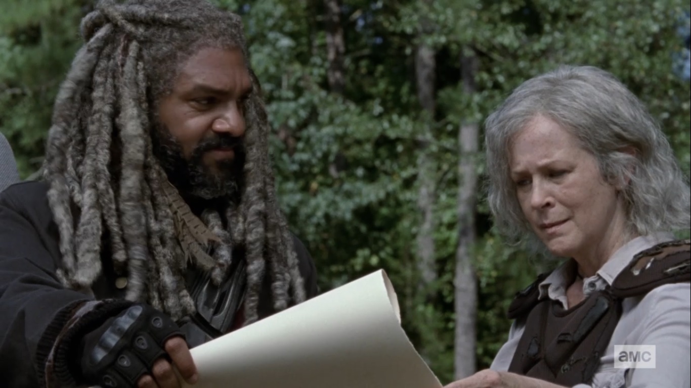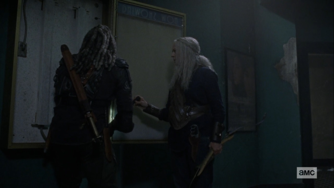 At the theater, Jerry and Dianne work on getting the bulb, though Jerry has to be extra careful. Ezekiel’s side-mission has its own side-mission, meanwhile, as he tells Carol that he’s getting a frame for the other leaders to sign the charter. He’s confident that Alexandria will join them, but Carol remembers what Michonne said. She doesn’t want Ezekiel getting his hopes up and worries that the fair isn’t enough.