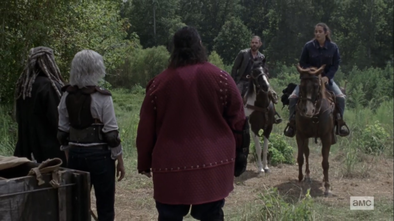 The episode begins with, of all things, a flashback: Ezekiel, Carol, and Jerry are in the woods, with Jerry saying that Nabila is pregnant. Congratulations. At last, Jesus and Tara arrive with medicine and supplies from the Hilltop. Carol is surprised to see the two, but Michonne has to soon realize that Tara won’t be returning to Alexandria.
