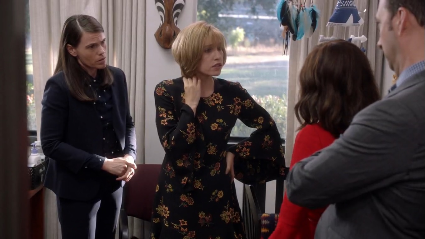 Selina then asks about Little Richard to use him as a prop, much to Catherine’s chagrin. Neither Catherine nor Marjorie want to say ‘No’ to the baby because they suck at parenting- my words, not the show’s- but Selina hands the baby back. As a now sobbing Catherine leaves, Marjorie reveals that Catherine has been suffering from postpartum depression, and it’s impacted the sex with Marjorie, too.