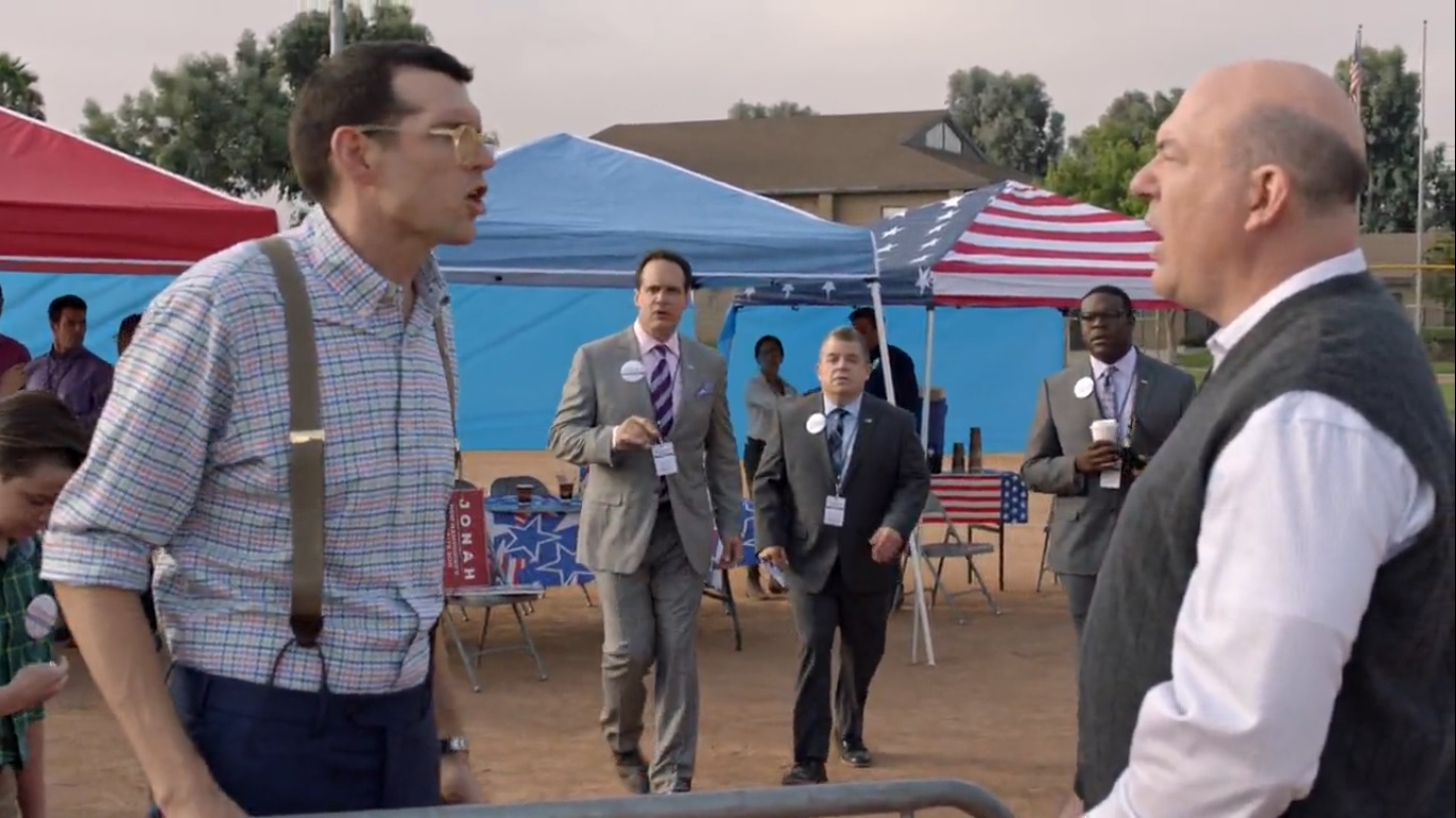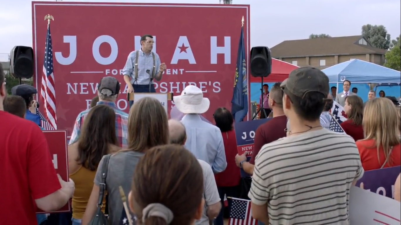 Over in Portsmouth, New Hampshire, Jonah holds a rally in Portsmouth and announces that he’s skipping the Iowa Caucus. He then introduces his 7-8-9 tax plan- it’s actually 9-8-7- while Teddy, Richard, and Bill watch from the side.