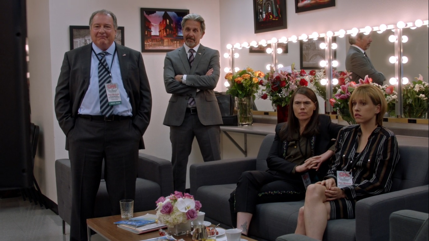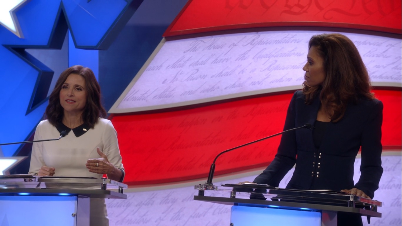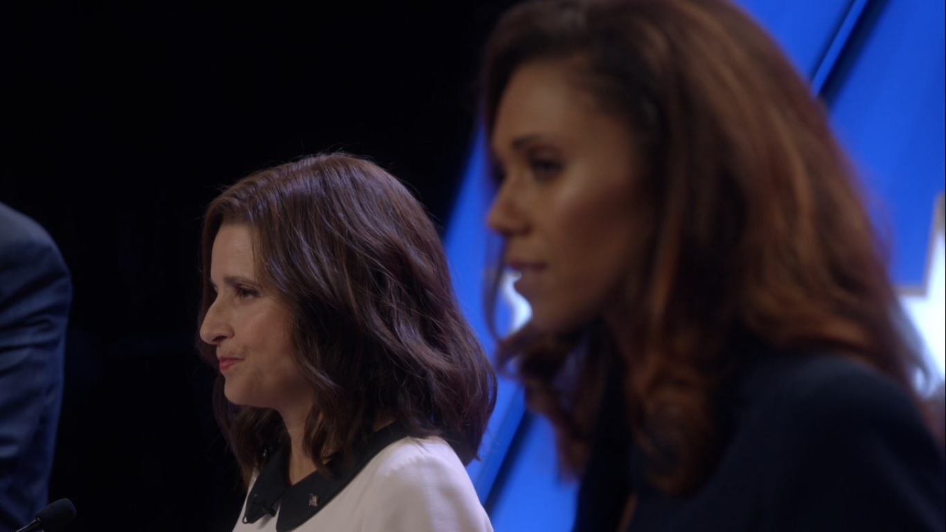 The main Presidential debate begins- this time Greg’s in the moderator’s seat- with Selina growing tired of Talbot repeatedly referring to herself as a woman and woman of color. Selina reminds everyone that she’s actually sat in the Oval Office and made tough decisions.