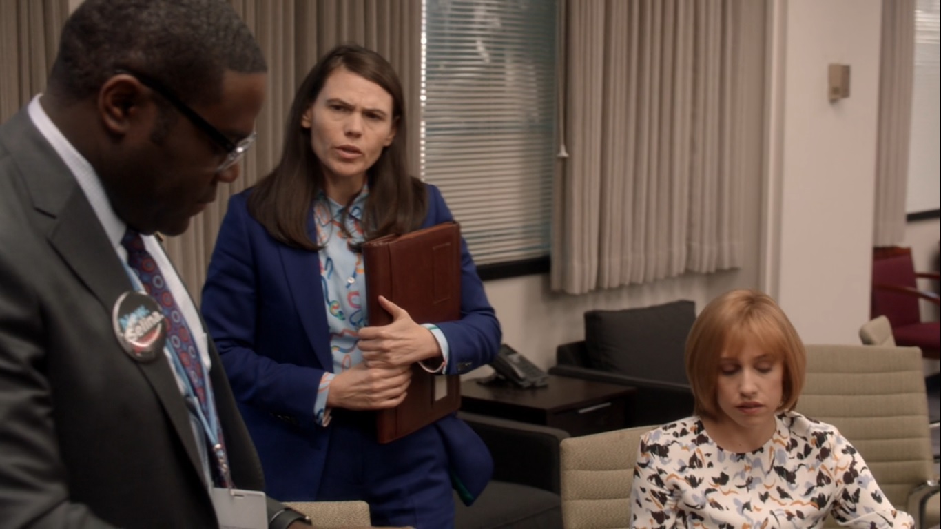 It’s time for debate prep. Dan starts off with a question about accusations of Andrew and the Meyer Fund stealing millions. As if on cue, Andrew arrives at the campaign headquarters. Along with his paralegal, Felicia, played by Morgan Lester.
