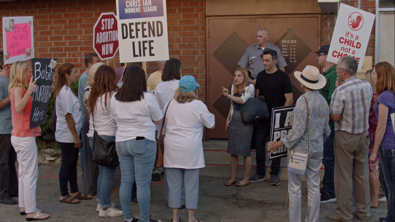 Dan escorts Amy to the clinic to get her abortion, and because Amy can’t help herself, she gets into it with some of the protesters.