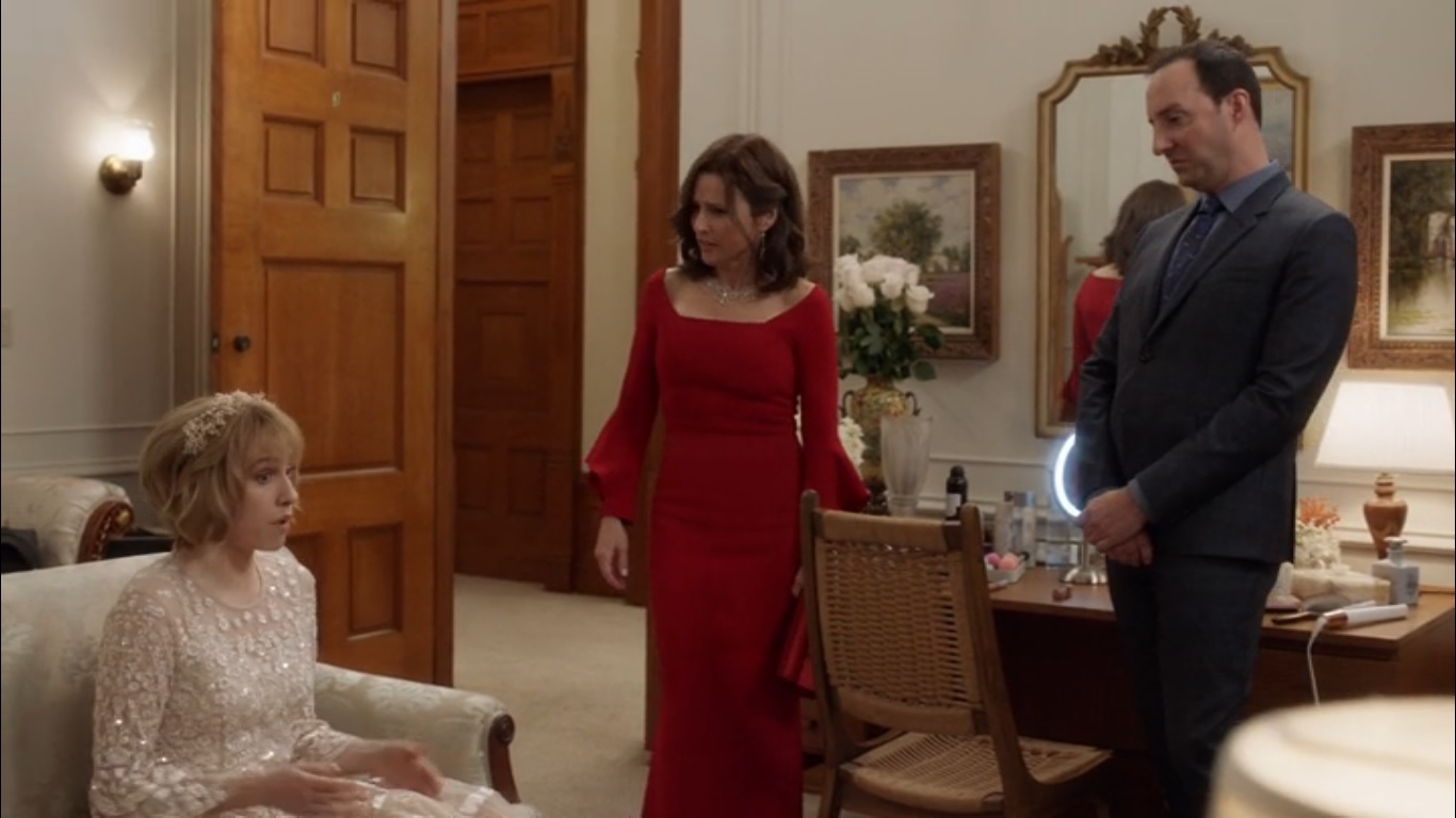 While Richard, Dan, and Governor Valentine pop by Nancy Ryan’s home, Gary helps Catherine get ready for the wedding. Selina strolls in, wearing a very presidential sort of dress, but it’s apparently the best she could do. Catherine rattles off a series of events that Selina does not remember, while Gary goes off to finger some sandwiches.