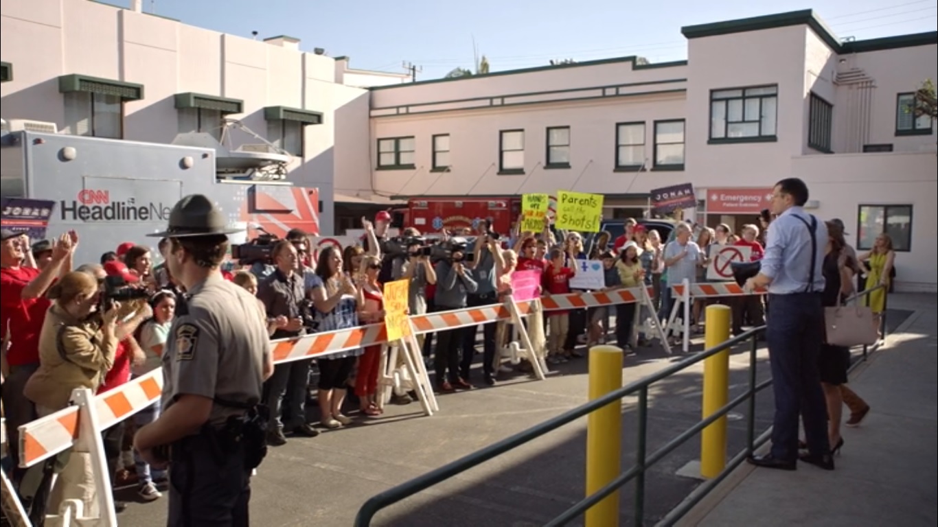 He and Beth then address the crowd, with Jonah telling the people that Pennsylvania has the second lowest vaccination rate in the nation. When he’s elected, though, they will be number one. Jonah then heads into the crowd to give some high-fives and hug a baby. A crying baby.