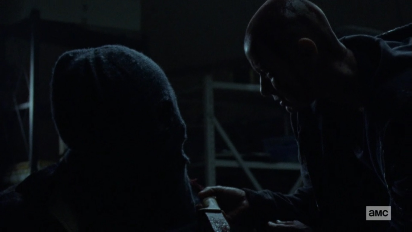 Alpha lifts the man’s mask and gets a look at his face, but we do not. He can’t leave his friend behind, but he won’t have to. As Alpha hands him her blade, the man tearfully begins cutting off the walker’s face.