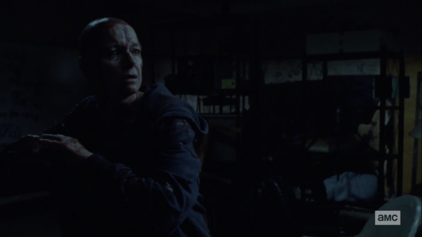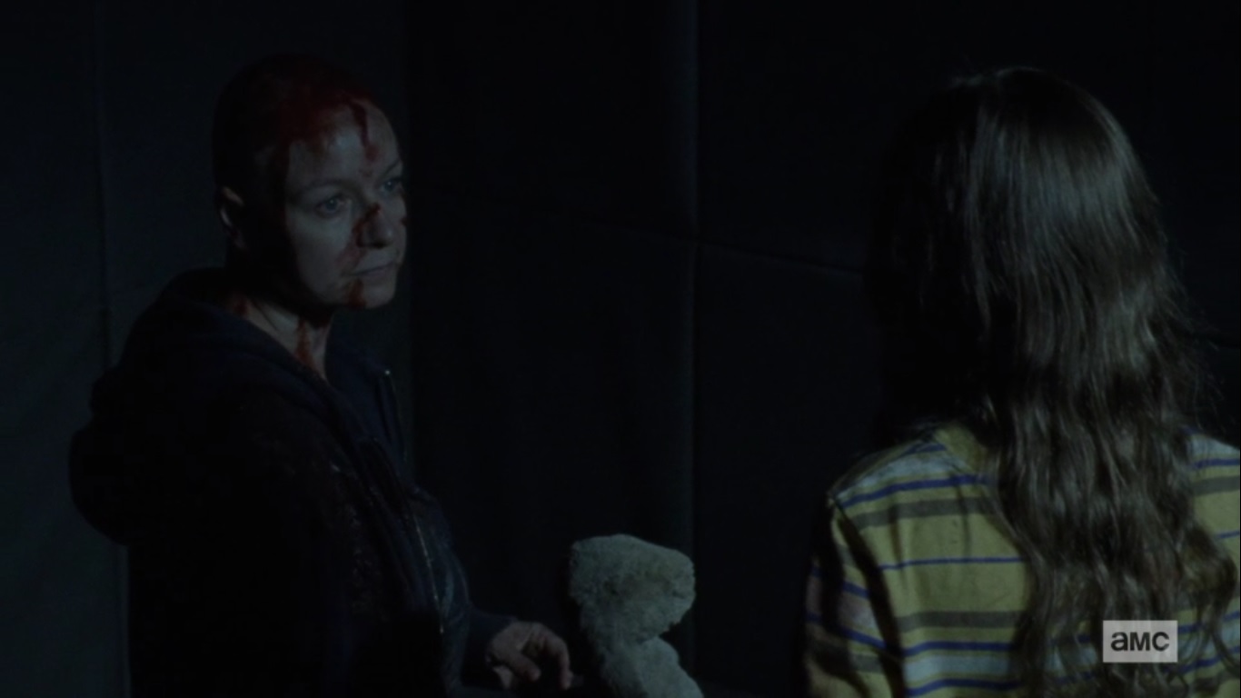 In the past, Lydia awakens and finds her mother sleeping next to buckets of blood and walker guts. She soon covers herself in it and stalks the halls while repeating, over and over, “We’re all monsters now.”