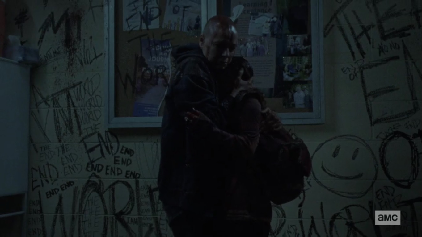 As the masked man caresses the walker, Alpha approaches him slowly, saying that the world went dark so that they could see a new path. She wants him to walk with her in the darkness so he’ll never be alone again. As the man says that he’s the end of the world, Alpha corrects him, saying that they are the end of the world. Well, roll credits, I guess.