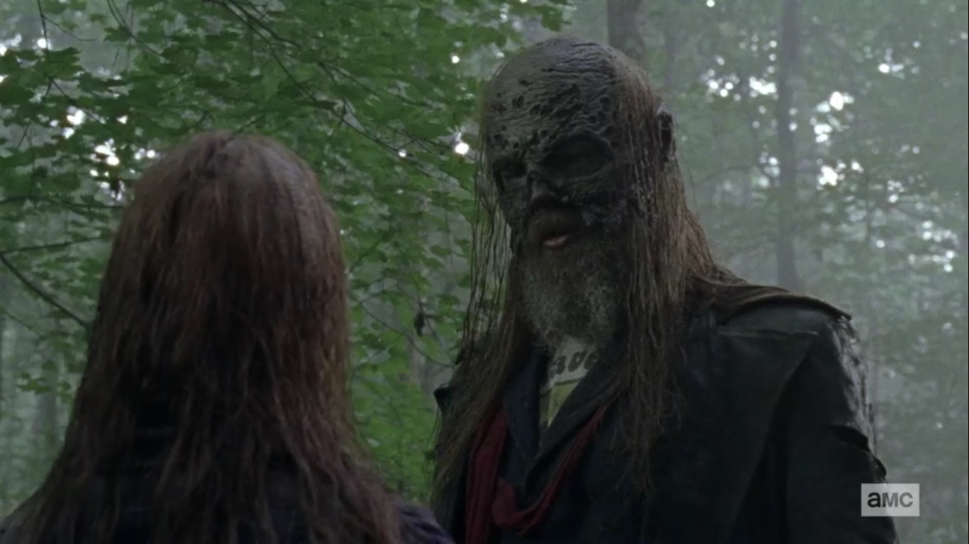 The man notes that Alpha is different than most, and Alpha figures that people who knew her prior life would say the same. Right now, she barely trusts anyone. The same applies to the masked man. As the masked man rips open the walker’s guts, Alpha refers to him as Big Man, then Mr. B. It’s a start, I guess. He reminds Alpha that she said they don’t have names, but B itself is just a letter. That much is true.