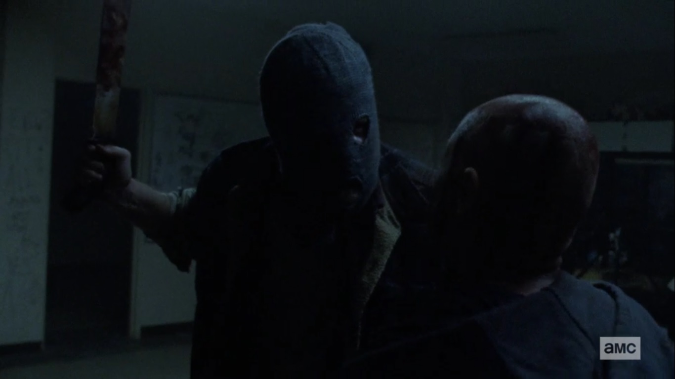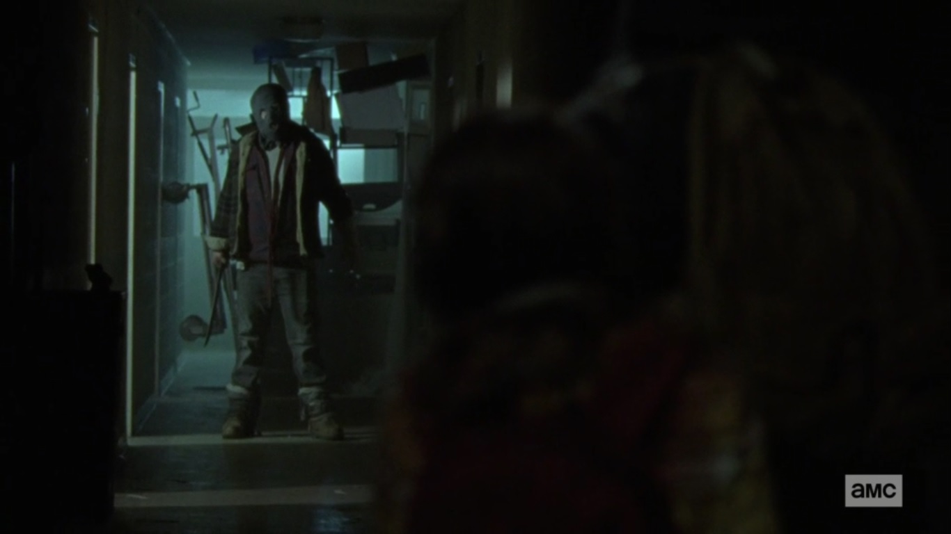 Of course, you’re not supposed to do that, so the two are forced to flee when the scream gets the attention of the walkers. Like any typical horror movie, most of the doors are locked, but Alpha manages to get one open before one of the walkers can grab Lydia. Alpha chastises her daughter for almost getting them killed again, but then Lydia’s attention is drawn towards a masked man at the end of the hallway.