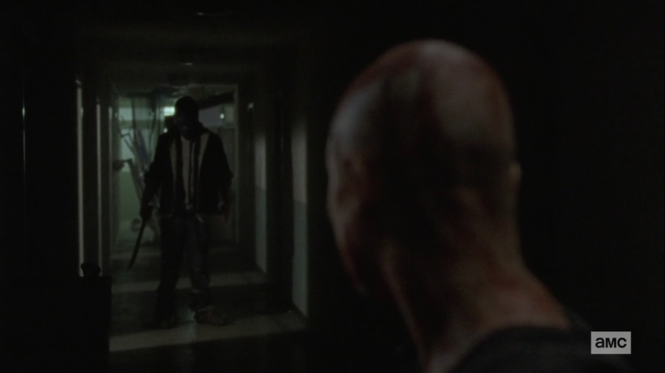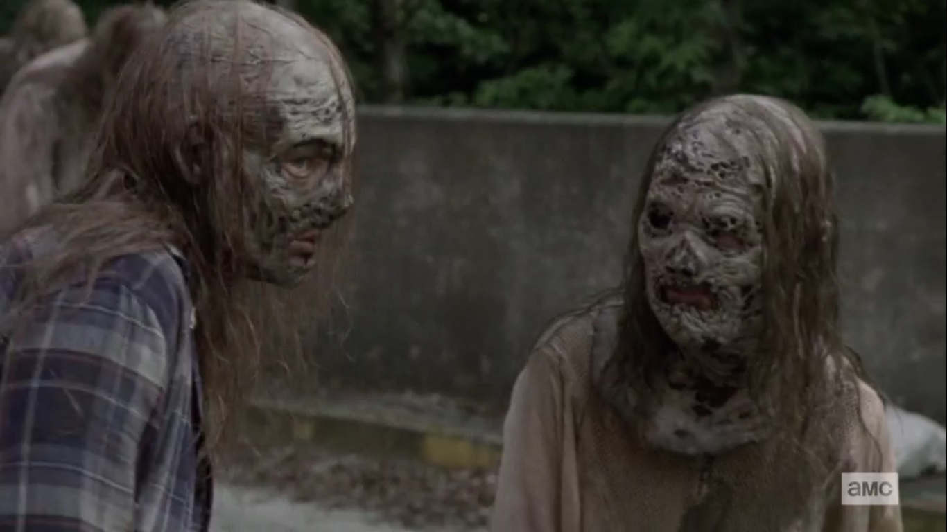 We return to the past as Alpha stalks the hallways of the compound while again humming that familiar tune. She happens upon a walker and takes it down, but soon enters a hallway littered with the dead. Alpha is quickly outnumbered, but the masked man whisks in and saves her as the two dispatch of the dead. Alpha, noting how much she enjoys killing with this man, begins slicing off the face of one of the walkers.