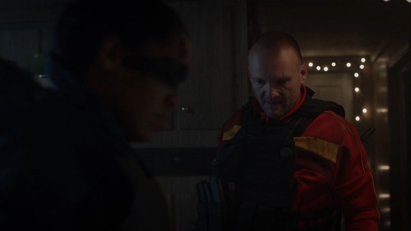 Judd asks Panda, played by Jacob Ming-Trent, to hand out the weapons, and Panda objects on the grounds that weapons should only be authorized if a majority of the officers feel that their lives are under direct, immediate threat. Judd asks two officers, Looking Glass, as well as Red Scare, played by Andrew Howard, if they believe their lives are in danger.