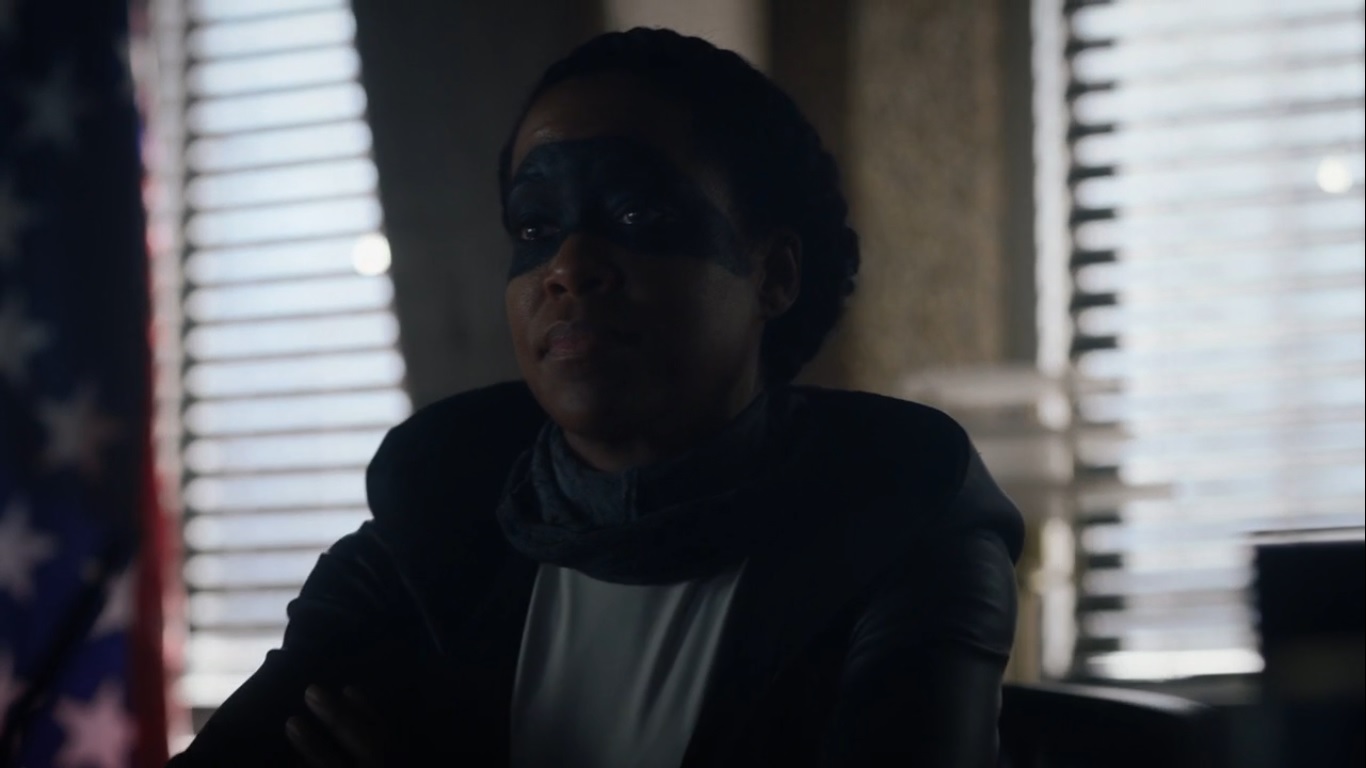 Angela enters the building, goes to a hidden chamber, and suits up. She then hits the road, Jack, and kicks one perp’s ass before heading into a parking garage. She heads up where the officers have assembled to watch a meeting of the Seventh Kavalry, which is no one, everyone, and invisible. They refuse to compromise and they want no one to get in their way, or there will be more dead cops. Tick-tock, tick-tock.