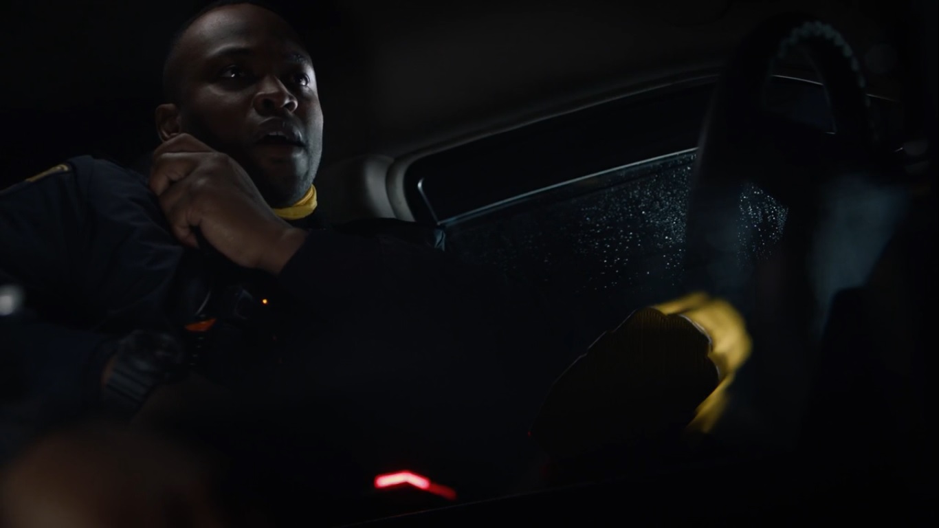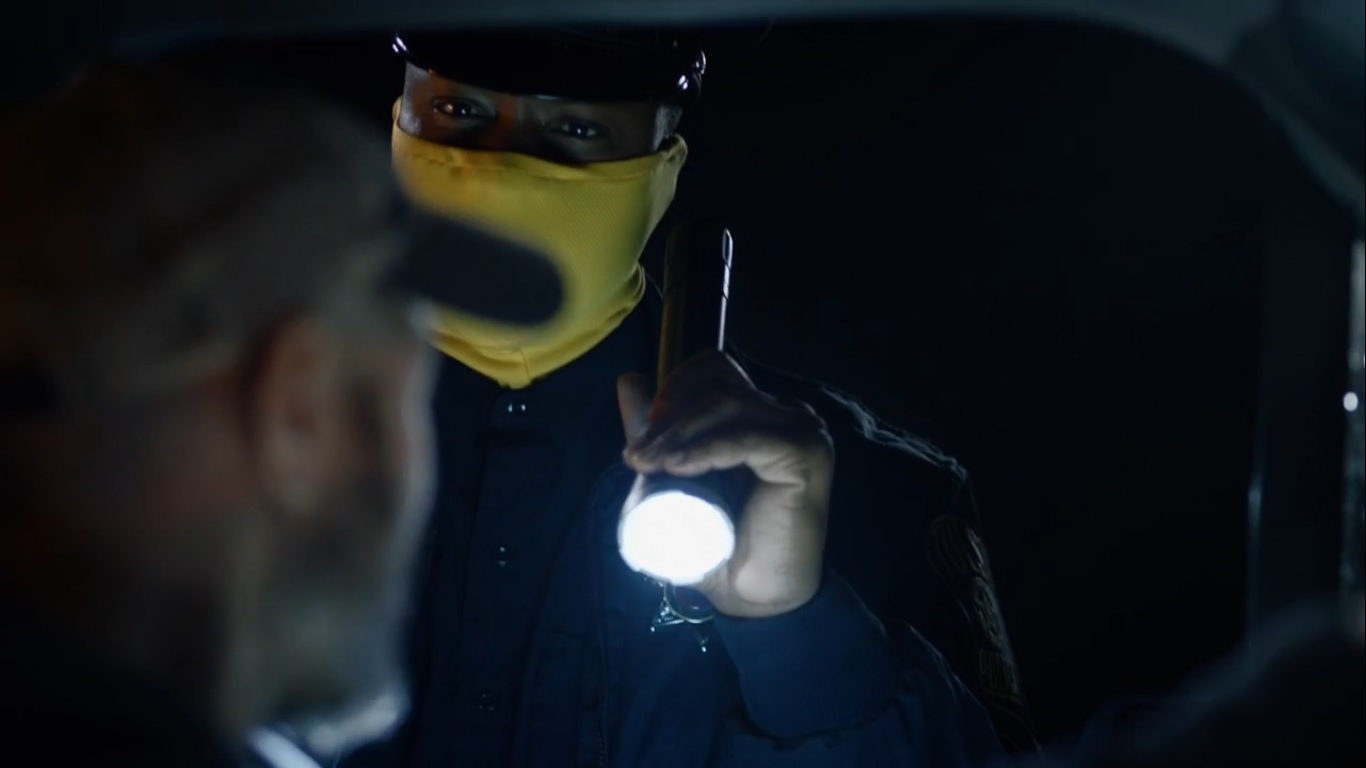 In present-day, we catch up with a man on the road when he’s pulled over by a police officer: Charlie Sutton, played by Charles Brice. Officer Sutton tells the man that this traffic stop is being recorded and asks what the man is drinking- it’s apparently Coca-Cola. As for what the man is hauling, it’s lettuce. Sutton asks to take a look, but the man wants to see the officer’s face, as it’s concealed by a yellow mask.