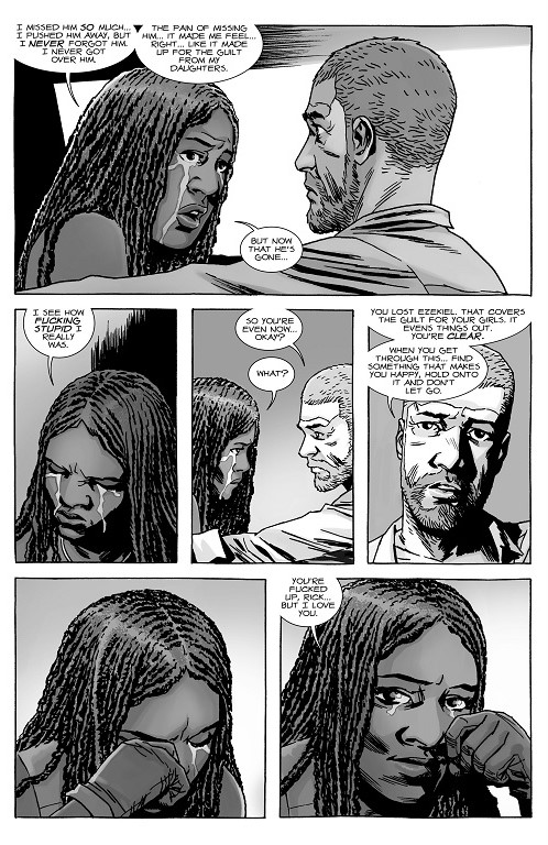 Whether unintentional or as a nod to their comic relationship, I did like the moment between Michonne and Ezekiel. I’d agree with Michonne that I don’t see a scenario where these two are an item. In the comics, I got that, but given Michonne’s love for Rick, coupled with Ezekiel reeling, these two are not compatible. Still, the kiss and talk about it afterward were nice moments of levity during an otherwise serious scene.