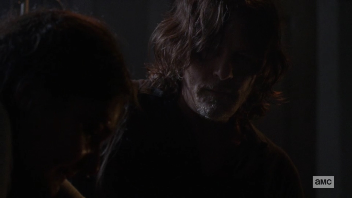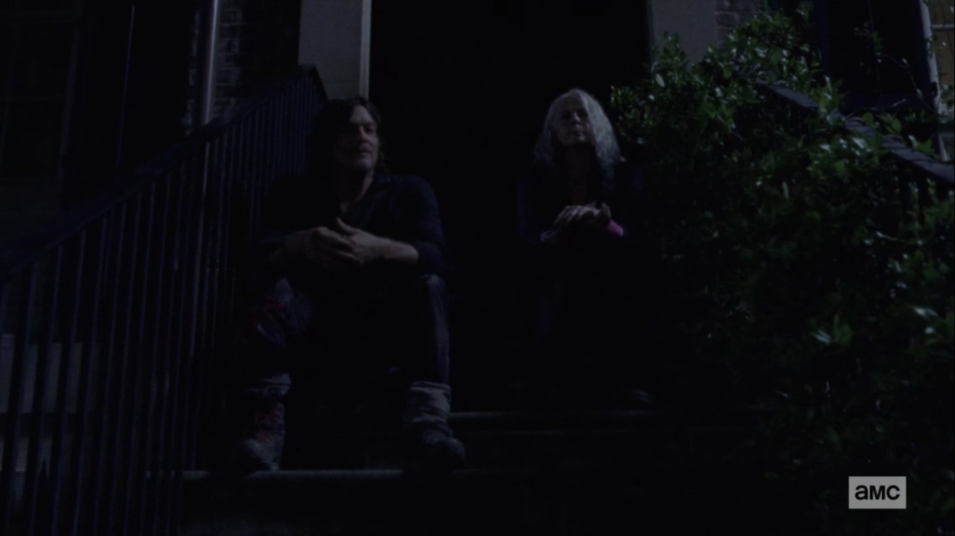 Outside, Daryl meets with Carol, who realizes that time never moved now that everyone’s talking about Negan again. Daryl doesn’t give a shit about Negan, but he does believe Lydia’s words. Carol thinks this is a distraction. After all, Hilltop has a tree through its walls, Alexandria was attacked- supposedly- while the real enemy is out there.