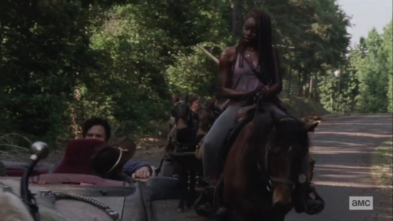 Is that the kind of bully that the Whisperers are? My, you are full of questions today, Judith. Michonne brings the caravan to a halt when she spots Ezekiel riding into the woods on his own. She tells the others to head onto Hilltop while she pursues the king.