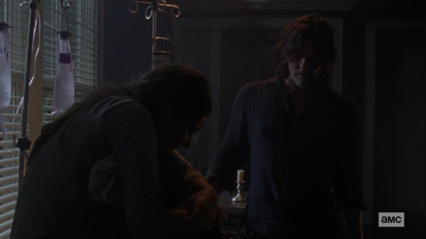 Back in Alexandria, Daryl radios Michonne on the situation while the Alexandria council speaks with Gage and Alfred. He gives his side of the story: Lydia lured him outside and Negan was with her. But if Lydia’s crazy, why would Gage, Alfred, and Margo agree to meet her in the dark? They were attacked, yes, and yet Lydia’s the one in the infirmary.