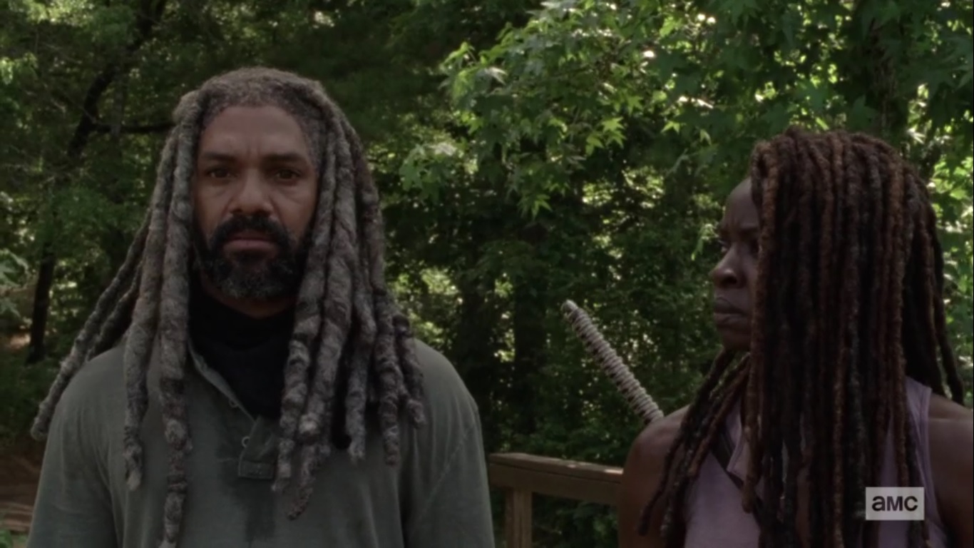 So Michonne heads into the woods and is surprised to see Ezekiel’s horse rushing past her. She soon finds the king standing near an edge and asks him to step back. He refuses, so she elects to join him and brings him in for a hug.