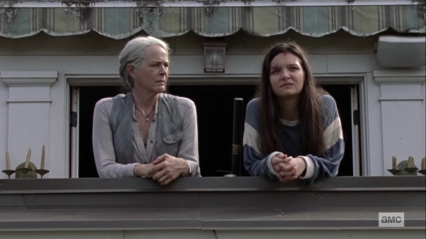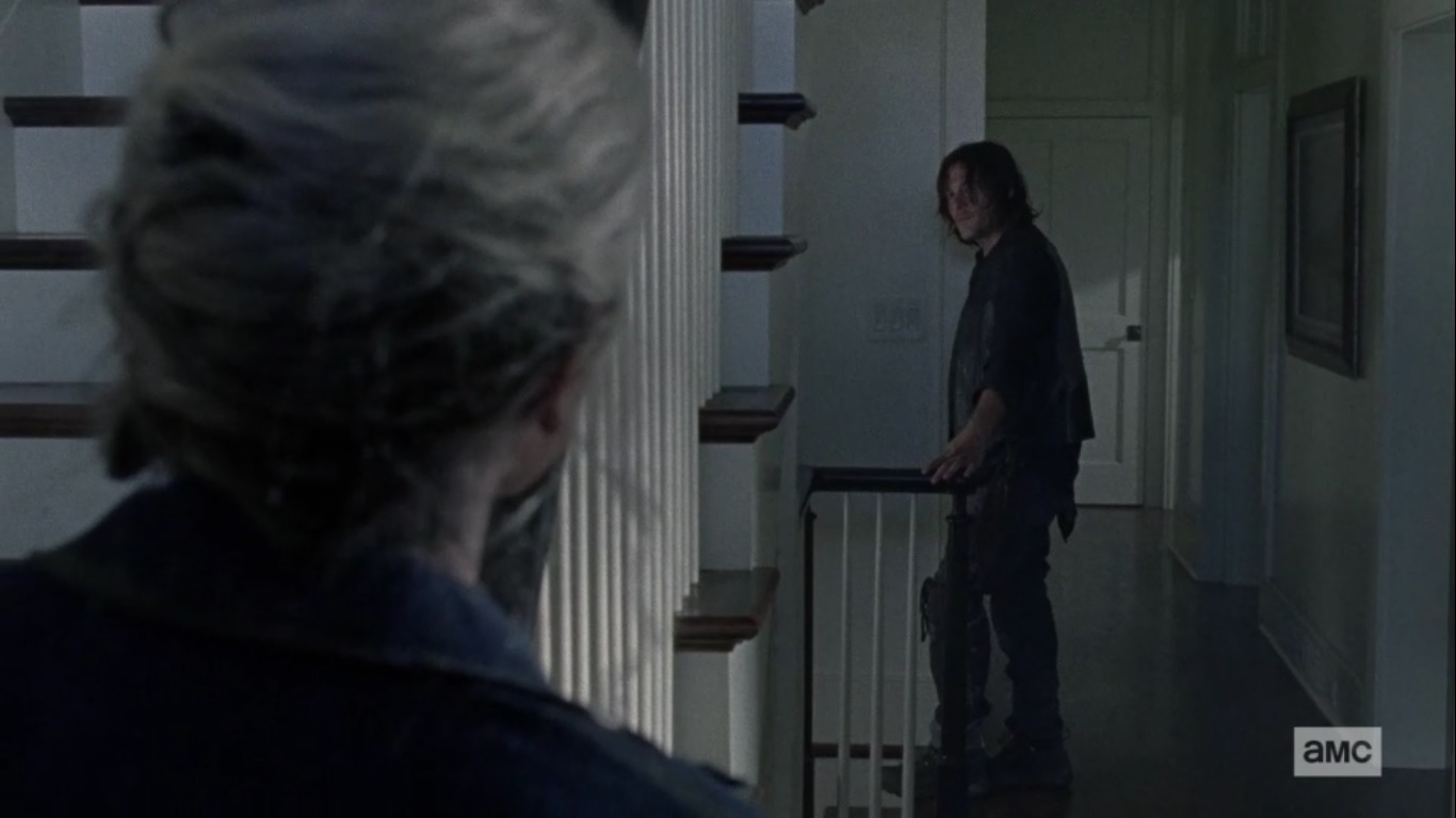While Lydia heads upstairs in Carol’s quarters, Carol thanks Daryl having her back with Gabriel. She knows that the Whisperer won’t talk easily and says that if Daryl wants to sit this out, he can.