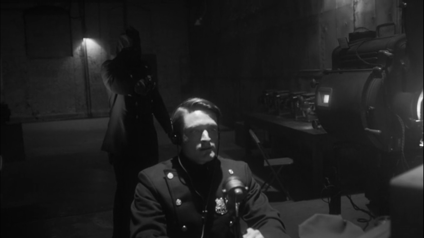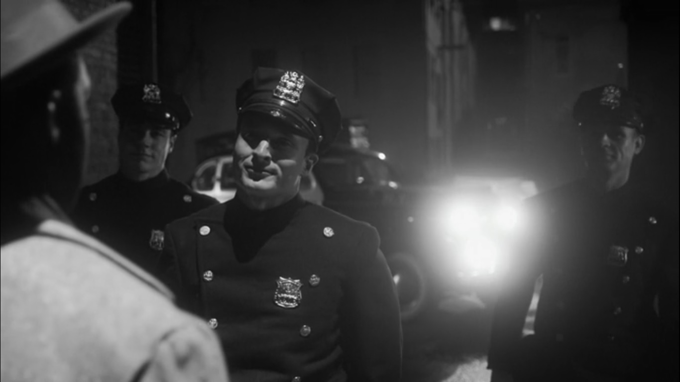 Why? Because she’s landed in a black and white world as a police cadet at a ceremony in 1938. The chief at the podium tells the officers to think about what they wear. The uniform that an officer wears changes them. They must honor the badge as they head forth. The chief then proceeds to congratulate the new cadets. However, we aren’t watching Angela, but a Negro officer instead.