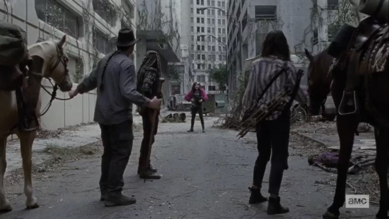 Same goes with the three heading into the city, as it had some unexpected levity with Ezekiel having a laugh at the walkers. Not sure what was so funny, but for Ezekiel in particular, it was nice to see him in good spirits. Plus, the town did look like the people died in the middle of Mardi Gras.