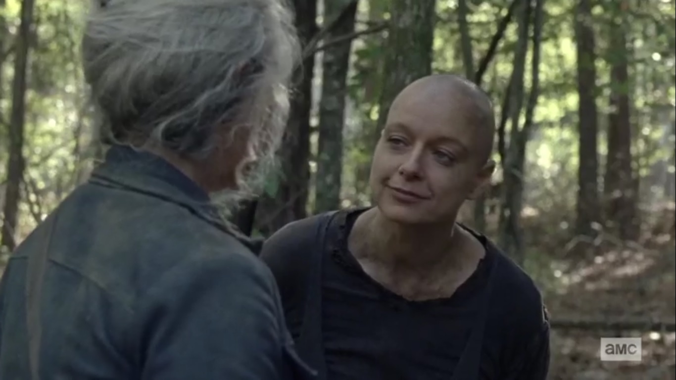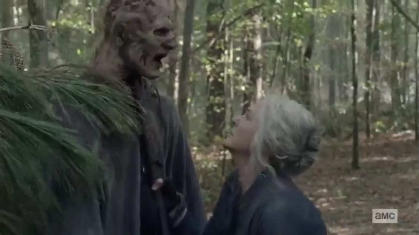 Speaking of, Carol does what she does best: be by herself. She goes through the woods until she hears what appears to be Alpha’s voice all around her. She turns around and sees a hallucination of Alpha standing behind her. What does Alpha say? She’s always watching.