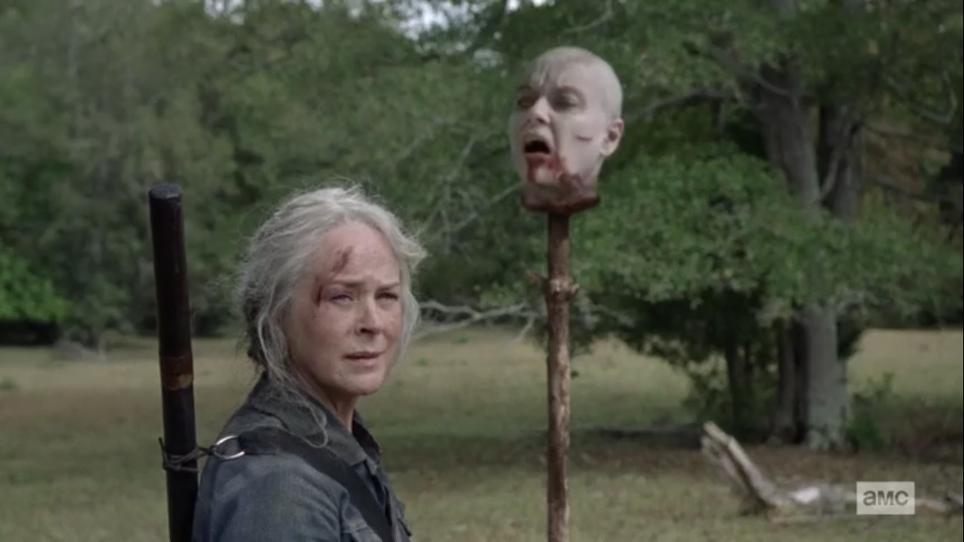 Jump forward to the present as Carol places Alpha’s reanimated head on one of the pikes. Negan asks if this is what she wanted, and it is. Negan’s ready to head back to Alexandria, but Carol wants to know what took so long. But Negan points out that he wanted to get out of this alive. Shit like this takes time.