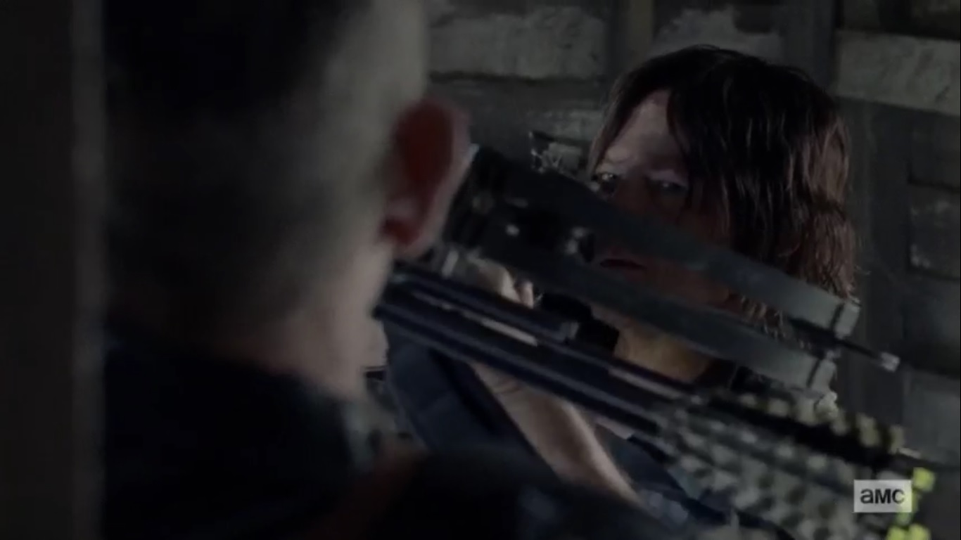 He likes the weight of the gun in his hands. While he never had a kid, he figures that holding a gun is the equivalent to holding a newborn. Except his baby kills people by spitting bullets. He orders Daryl to kneel and admits that Daryl was right- he did like it. This goes like you’d expect it to: instead of Negan killing Daryl, he takes out the Whisperers instead. Once the deed is done, Daryl orders Negan to untie him.