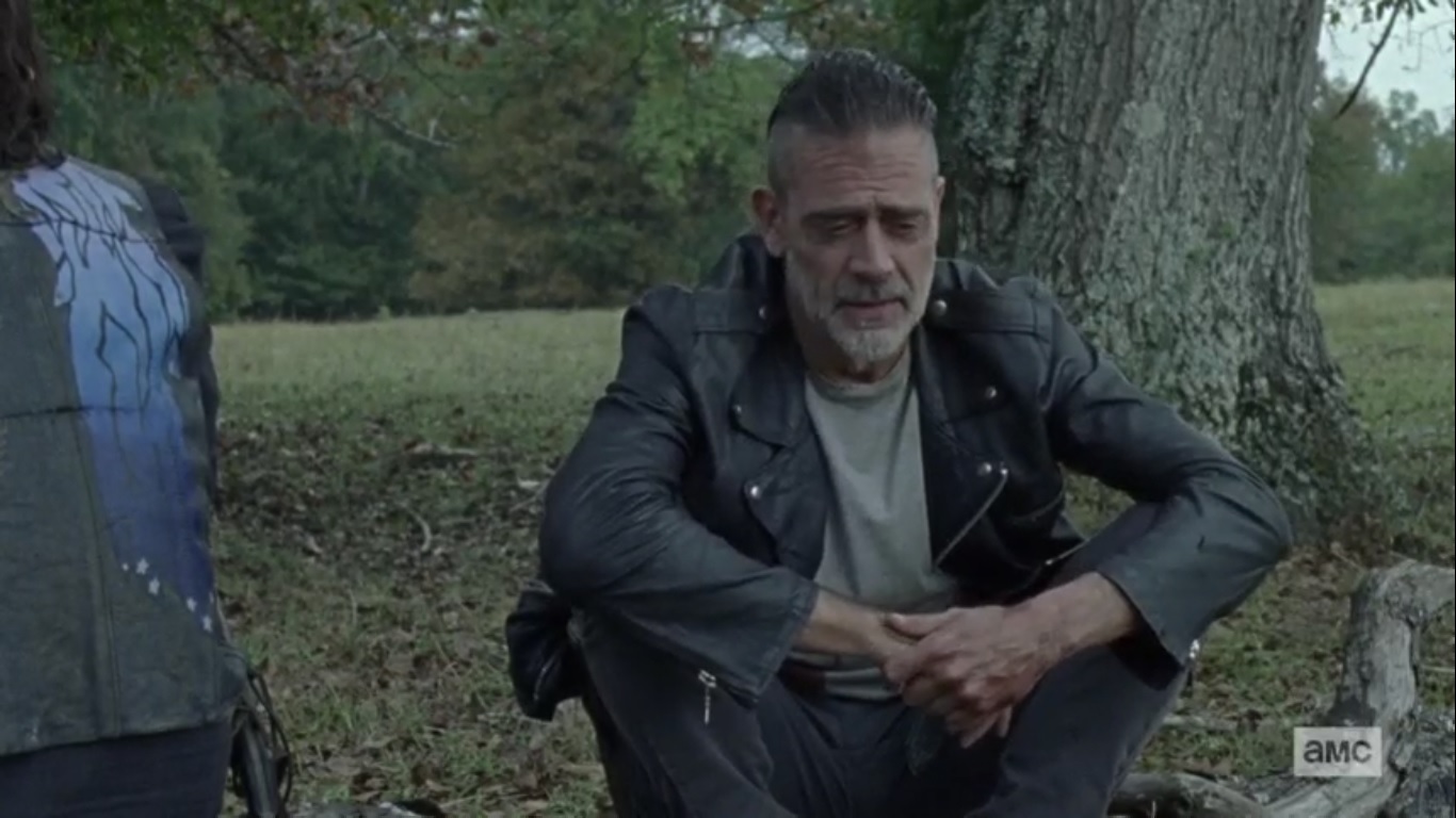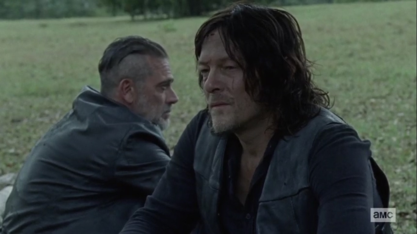 Back to Daryl, who has Negan walking with his hands behind his back. It’s familiar to how things went with Alpha. Negan surmises that Daryl is upset that Carol didn’t let him in on the plan, and Negan is upset, too. Lone wolves don’t think about the pack. Daryl, though, might be upset because the kids at Hilltop almost died because of Negan.