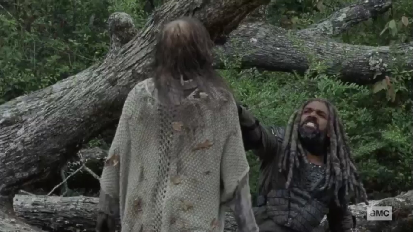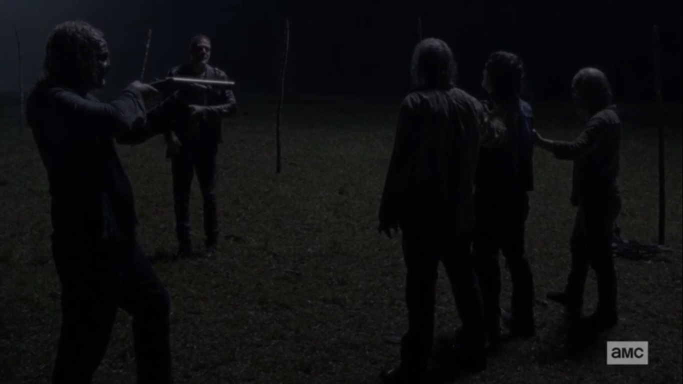 Daryl figures that maybe Negan liked being among the Whisperers, but speaking of, three Whisperers emerge from the darkness and hold the two at gunpoint. One of them tells Negan that Alpha is dead because of him. As such…the Whisperers will kneel to the new Alpha.