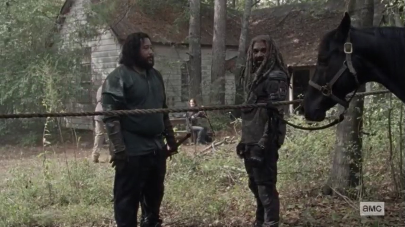 As Ezekiel, Yumiko, and Eugene make camp for the night, Ezekiel hears one of the horses whining in pain. He inspects the horse and finds a bite mark. As he pulls out his blade, he tells the horse that it won’t be in pain anymore. With that, he puts the horse out of its misery. He takes blame for coming, even though Yumiko assures him that this was just an accident.