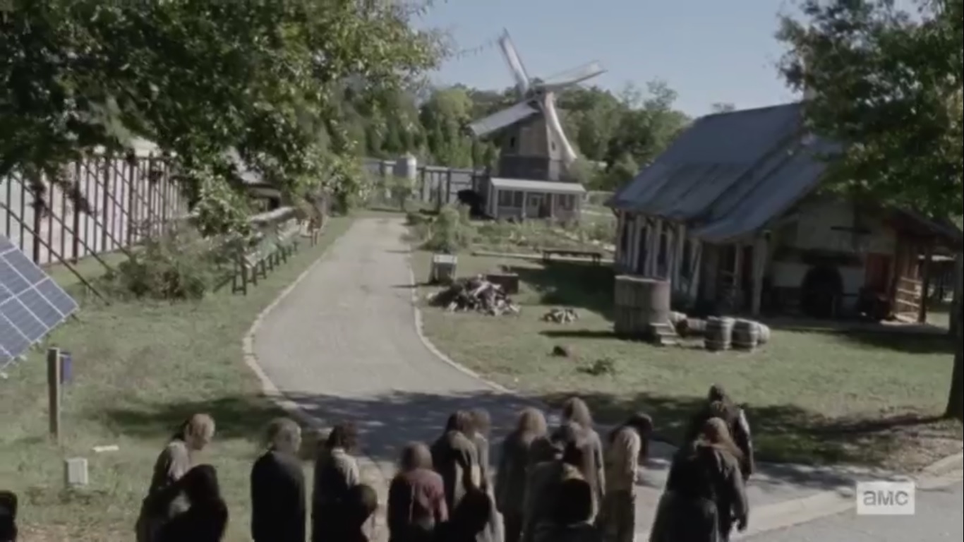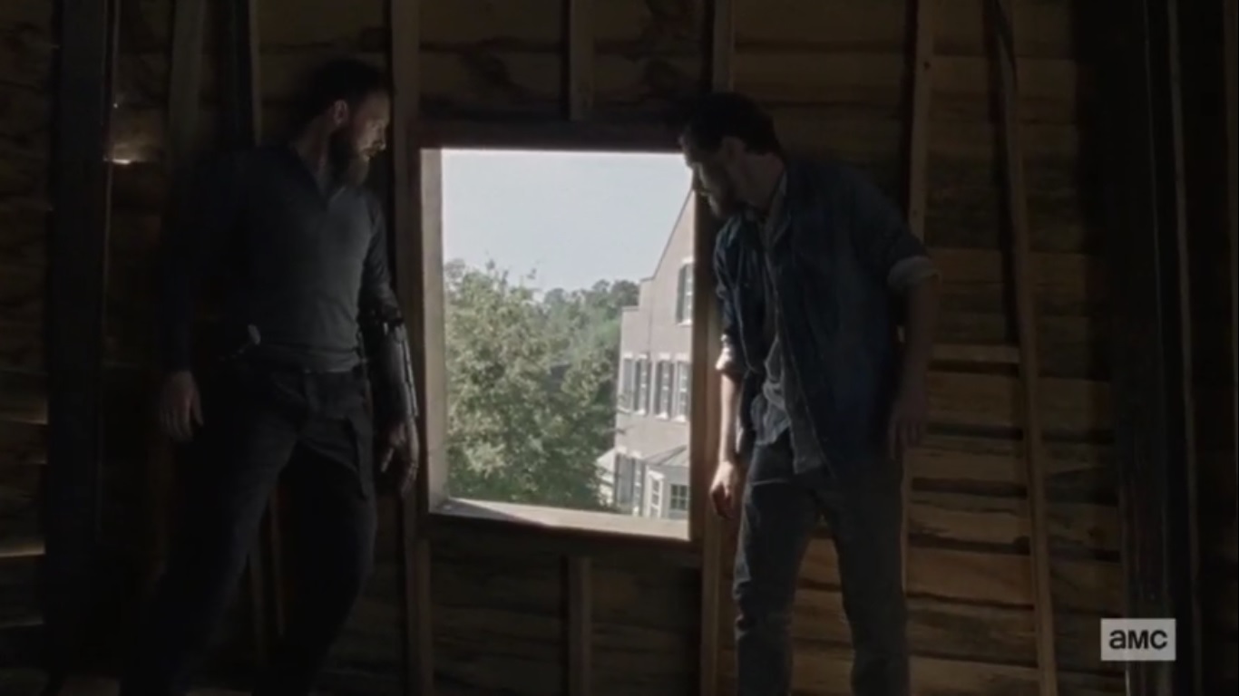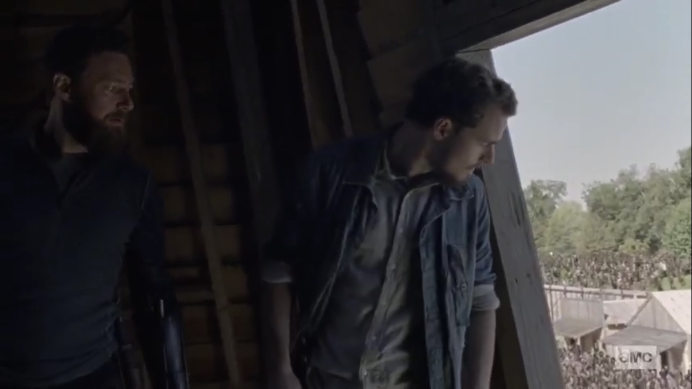 I assumed he would’ve led the herd back to Alexandria and just waited there, but no. I’m guessing that they learned about the tower’s location from Aaron and Alden who, again, why the hell were they still in Alexandria, and in the windmill of all places? Just watch the Safe Zone from a distance!