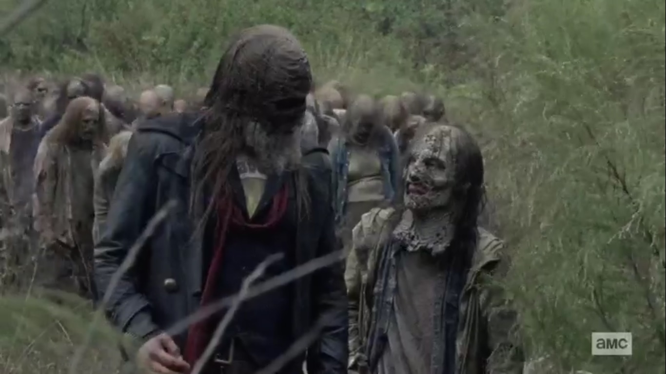 As luck would have it, several walkers soon approach. Daryl gets an arrow in one walker that turns out to be a Whisperer, who soon runs off. After downing the remaining walkers, the two head off in pursuit of the Whisperer.