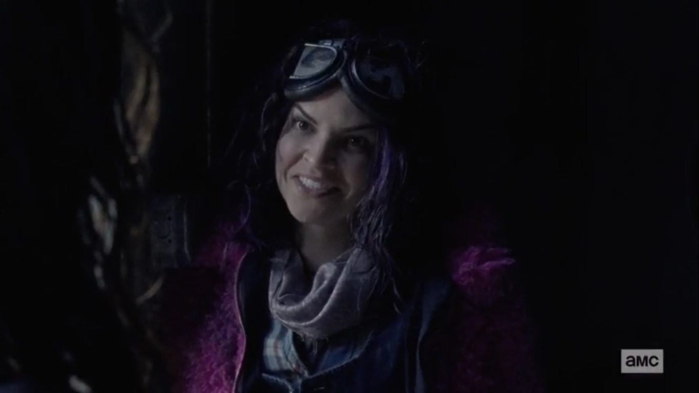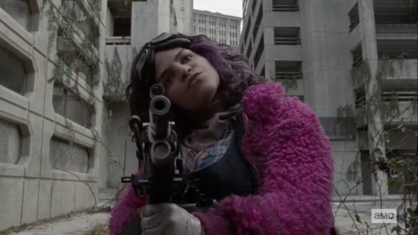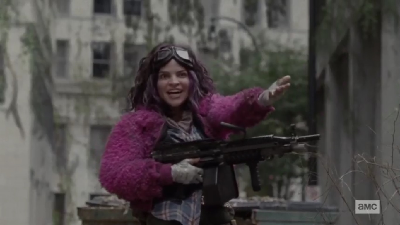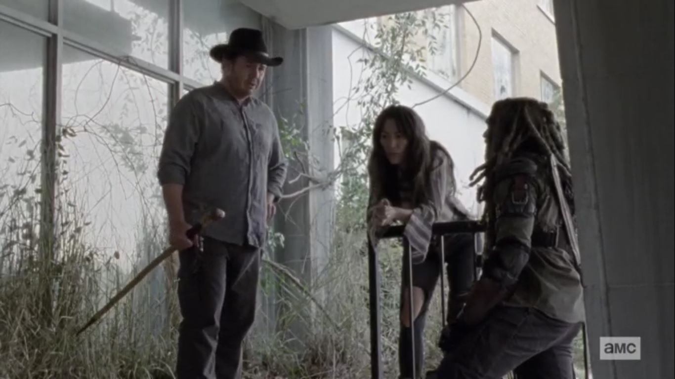 The episode begins with Yumiko, Eugene, and Ezekiel still surprised at the sight of this mysterious stranger. The woman points out that they’re the ones who caused commotion and she thought they needed help, but now they’re acting like she’s the problem. This woman hasn’t seen anyone in over a year, so the three aren’t exactly making the best impression. Her pointing a gun doesn’t exactly help, either.
