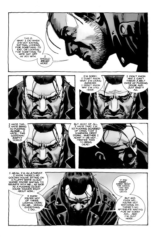 Charlie Adlard is great here with his always stellar artwork. He takes us through Negan’s range of emotions, but what the man is really feeling is loneliness. Absolute solitude takes its toll. True, Negan isn’t technically without allies. The other communities didn’t exactly go away, but I imagine that after Negan’s last confrontation with Maggie and Dante, he hasn’t had much contact with the others.