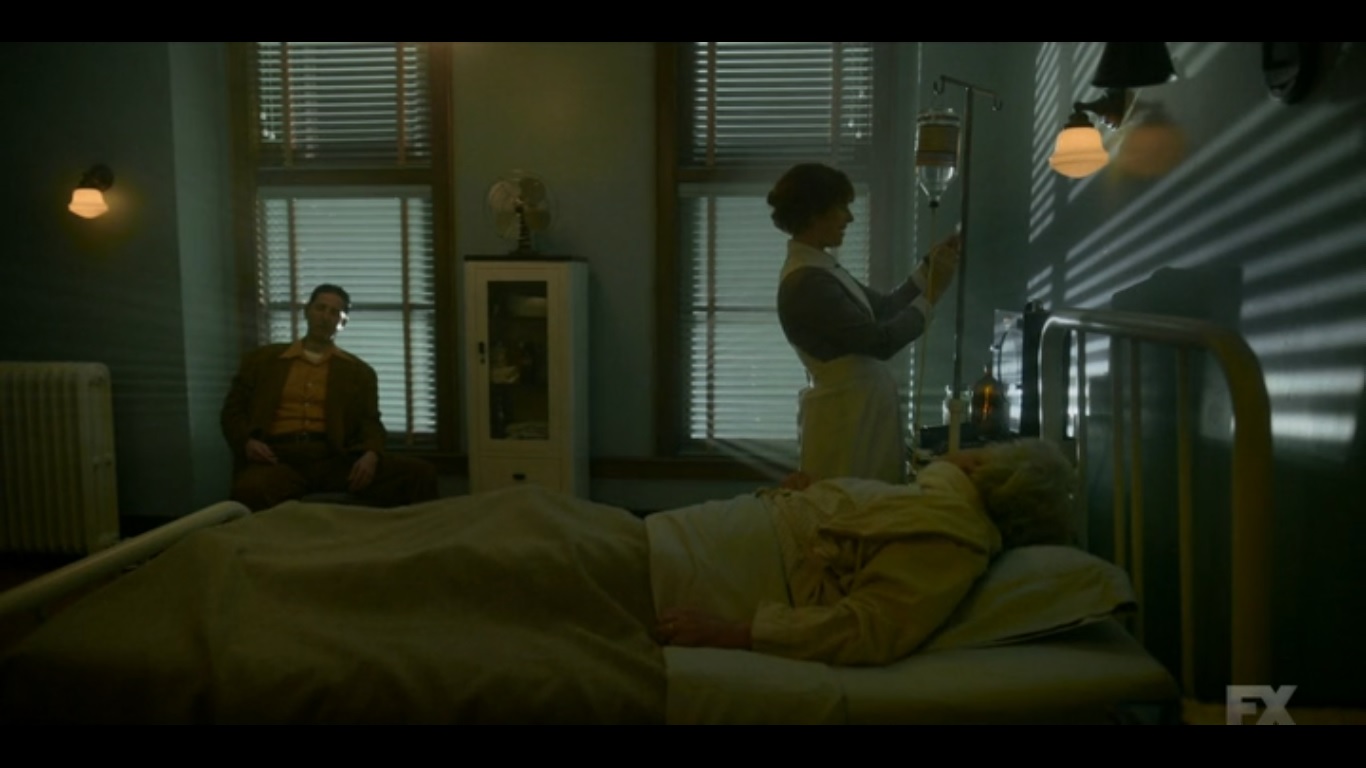 Elsewhere, Ethelrida sits on the swinging bench outside her when a bus pulls up. Eventually, Nurse Mayflower exits as she heads to the building opposite where Ethelrida sits. She watches as a light in the building illuminates, but then Thurman exists and joins Ethelrida, beckoning her to come inside.