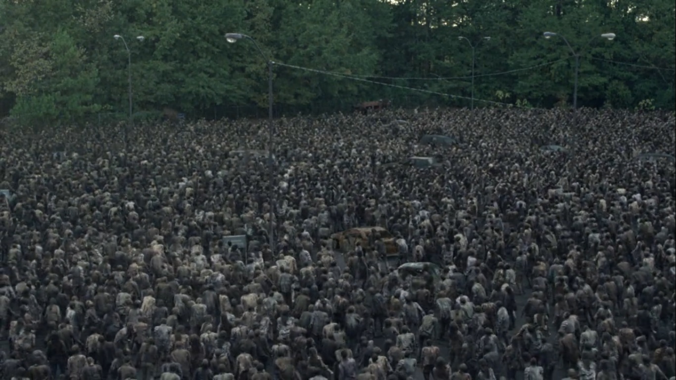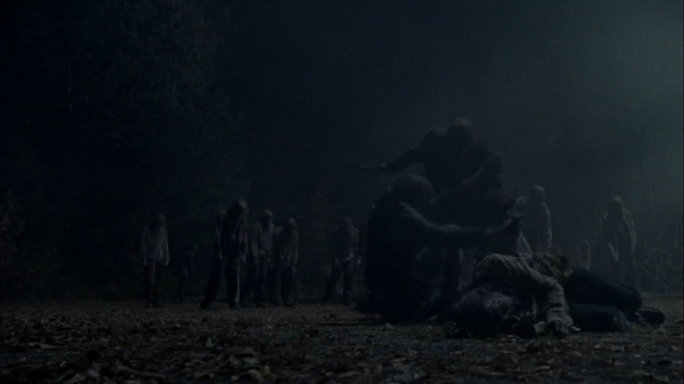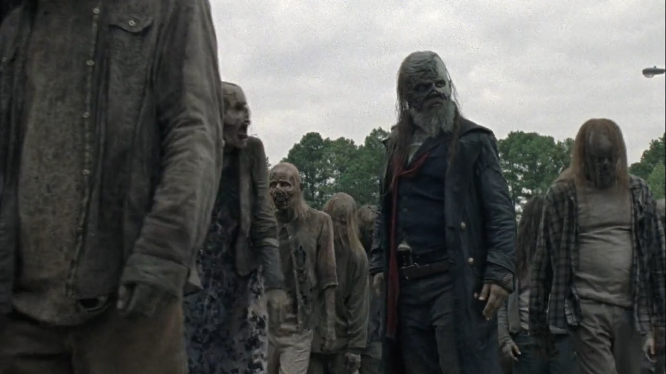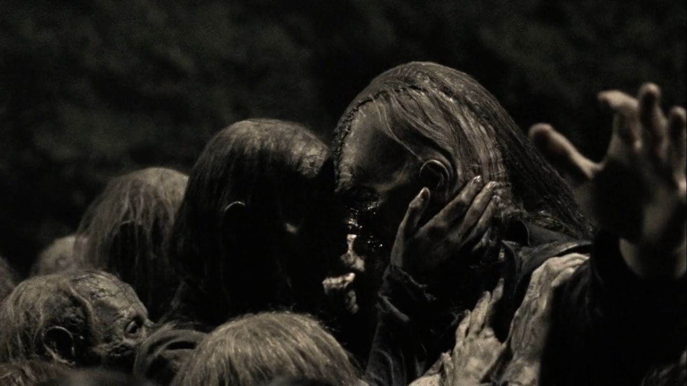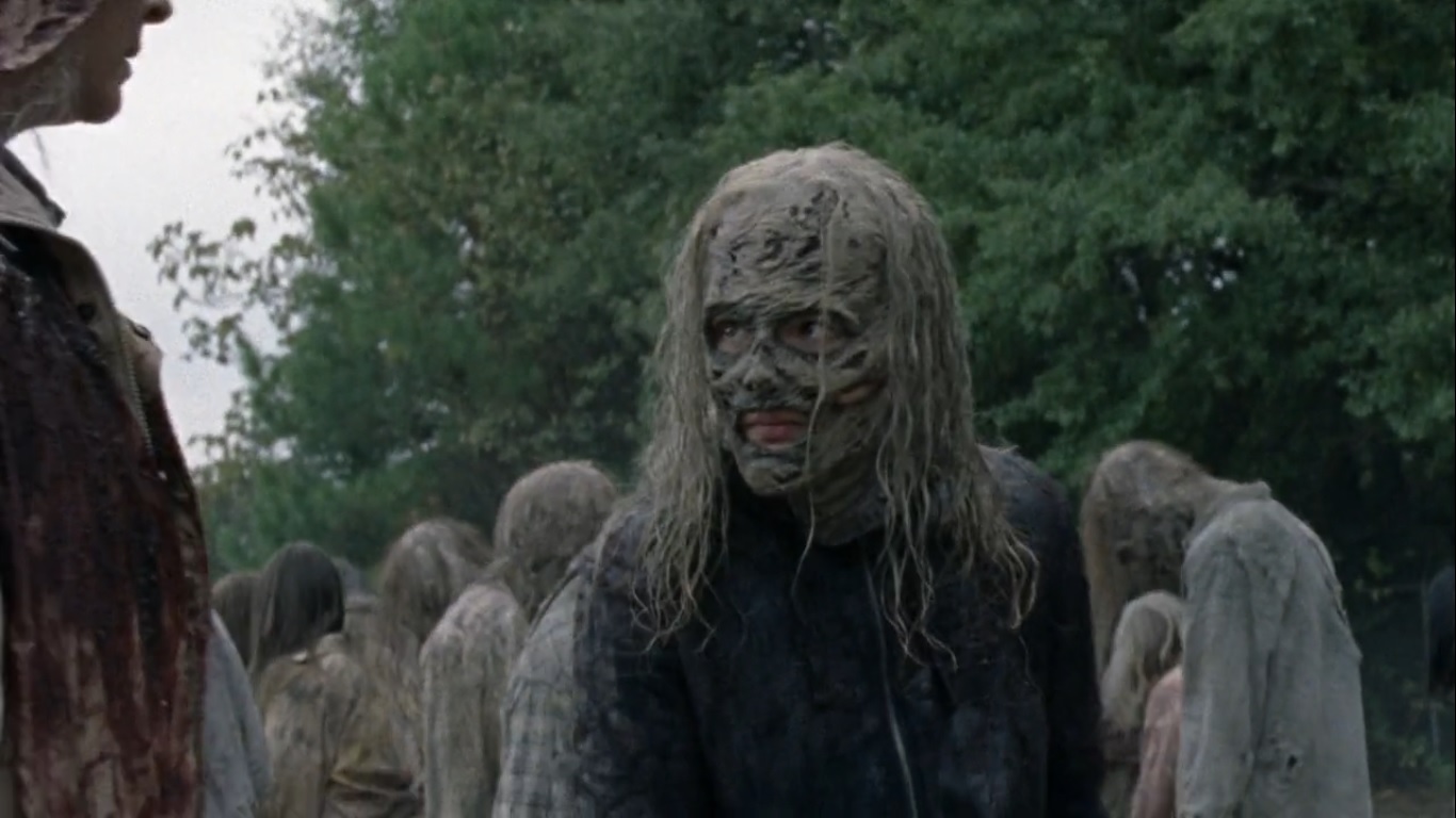 With walkers pressed among them on all sides, everyone makes their way through the herd. As one Whisperer approaches with a blade, he’s taken down by an arrow and become a meal for some walkers.