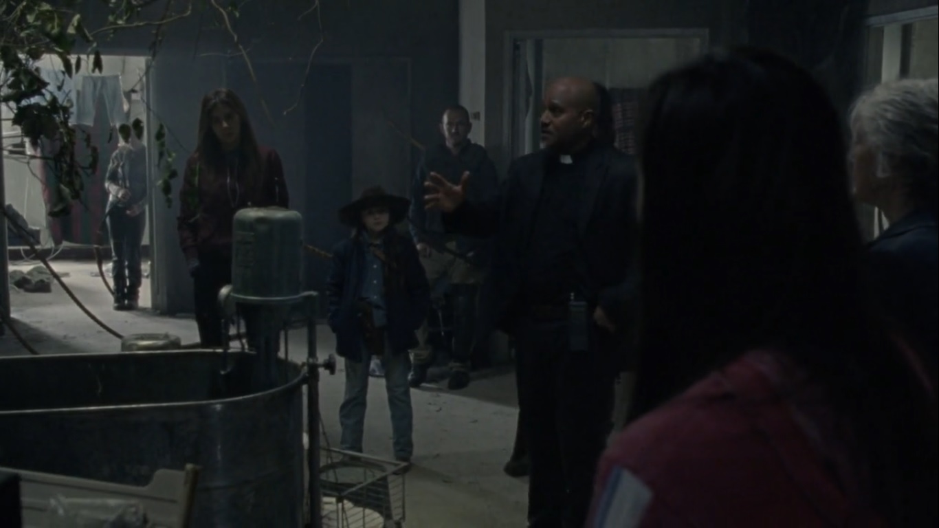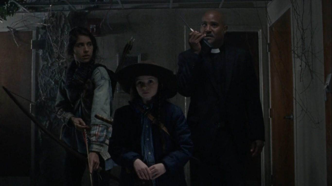 Lydia realizes that Beta is onto them, but Rachel has her sights on a Whisperer. Before she can fire, they hear an explosion- one of the Whisperers tripped Daryl’s trap. Judith retreats as everyone realizes that the Whisperers are headed upstairs. The survivors start setting up barriers while Gabriel goes over the extraction plan. Children and the wounded go second, and if Rosita argues…then someone needs to grab Gabriel.
