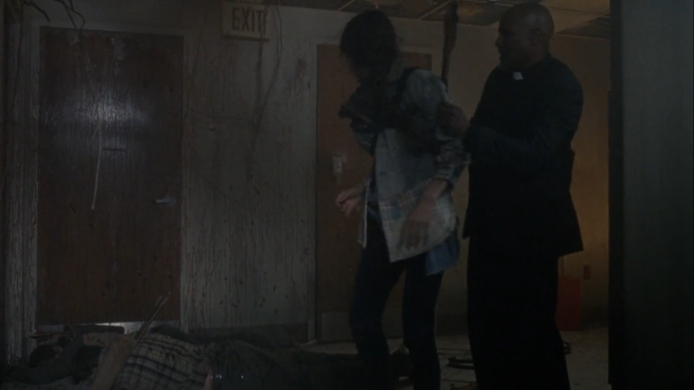 Upstairs, though, the Whisperers continue breaking through the barriers. Evacuation has begun, but it’s going to take time to get everyone out. A grenade is thrown into the corridor and takes out two red-shirts, but Gabriel and Rachel survive. Again, red-shirts, so who really cares?
