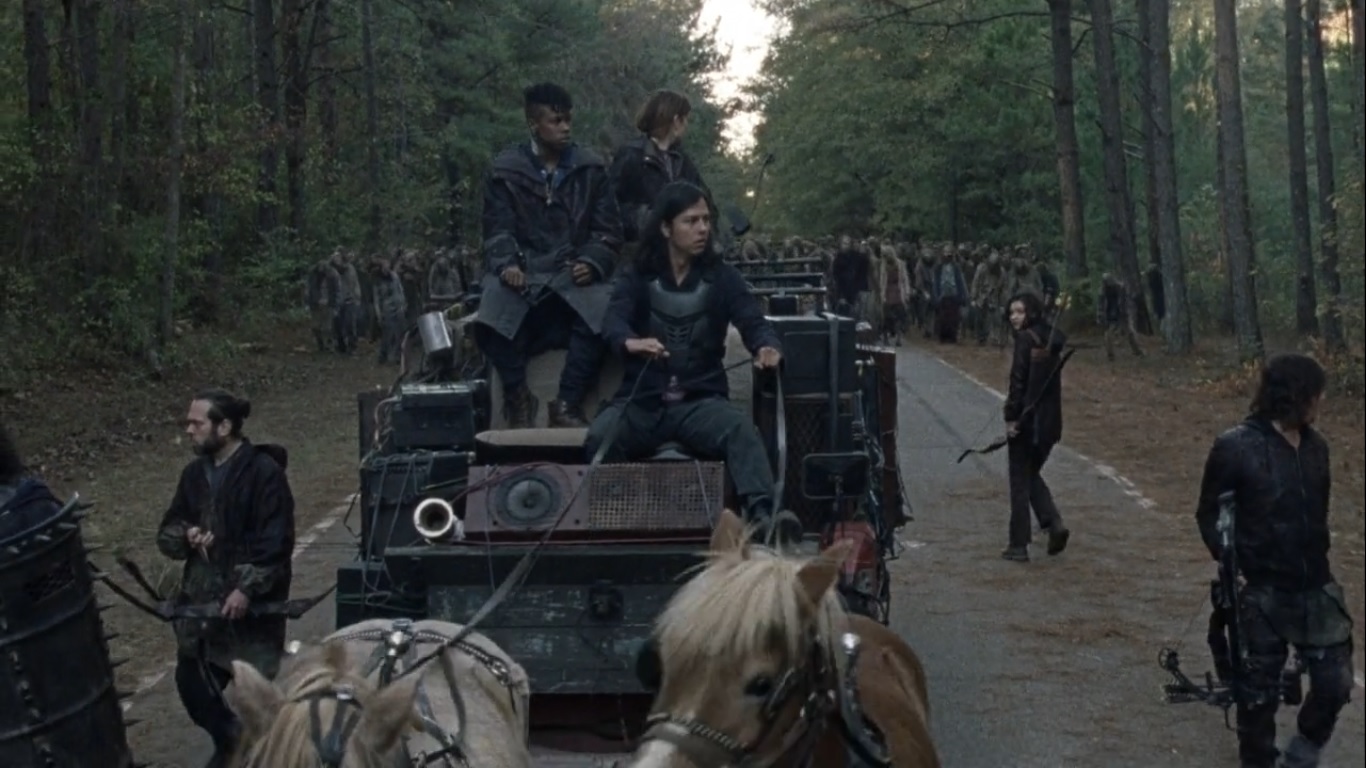 Night falls as the outside team continues leading away the herd. The Whisperers hasten their advance, using walkers as shield from incoming arrows. This forces the survivors to fast forward not the music, but their escape. They manage to take out some Whisperers, but one resourceful Whisperer tosses a chain into the road, thus dismantling the wagon.