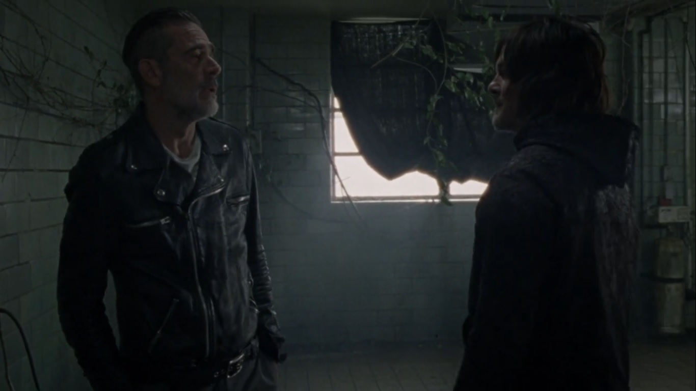 While Luke lathers Jules in walker guts, Daryl gives Kelly a Whisperer mask for protection. Negan, though, isn’t covered up because he has no intention of going out there. After all, killing Alpha makes him a prime target for the Whisperers, so he feels no one should be next to him. Daryl calls bullshit on that, saying that if Negan wants to help, he has to put his ass on the line like everyone else.