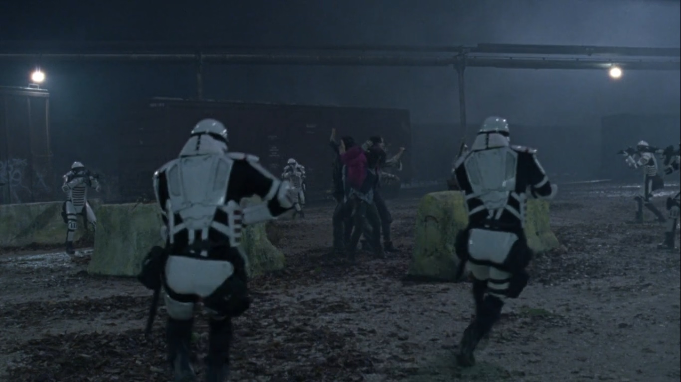 Then lights turn on all around the four. Armed soldiers in white armor rush from all directions and order the four to lower their weapons as the episode comes to a close…
