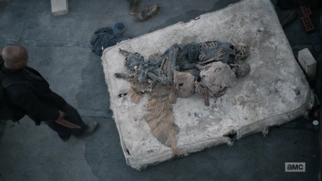 Gabriel heads to the roof and finds the remains of people who appear to have been living on the roof- including a coupled that perished in each other’s arms. Near them is the message “Save Us” written on the ground.