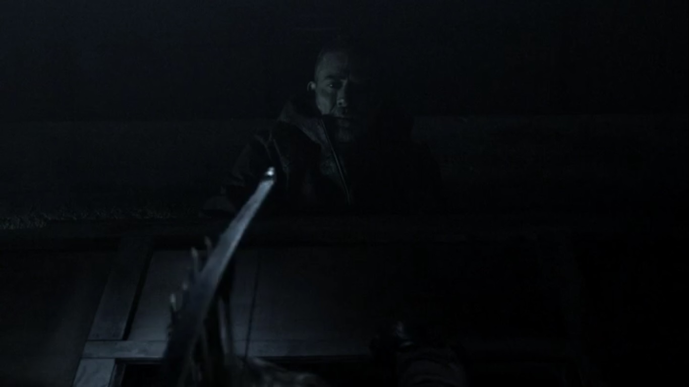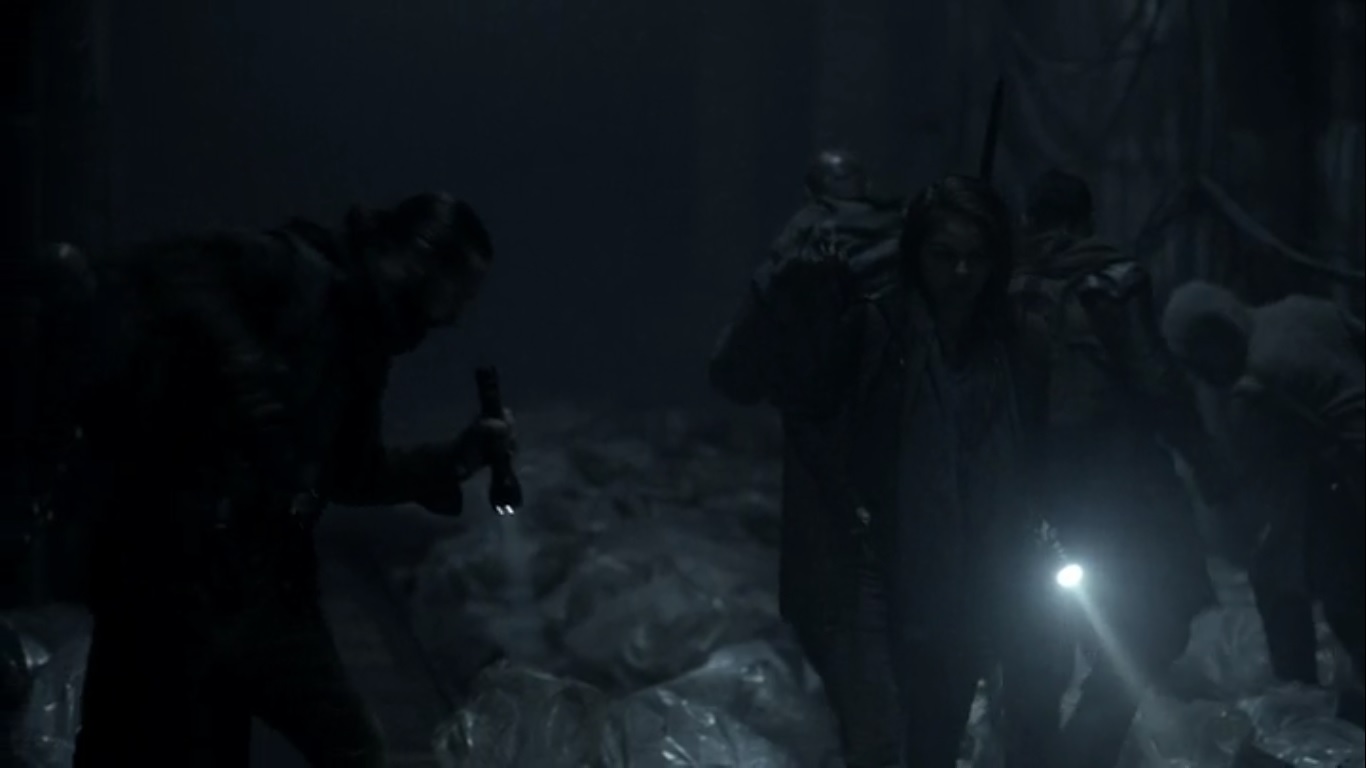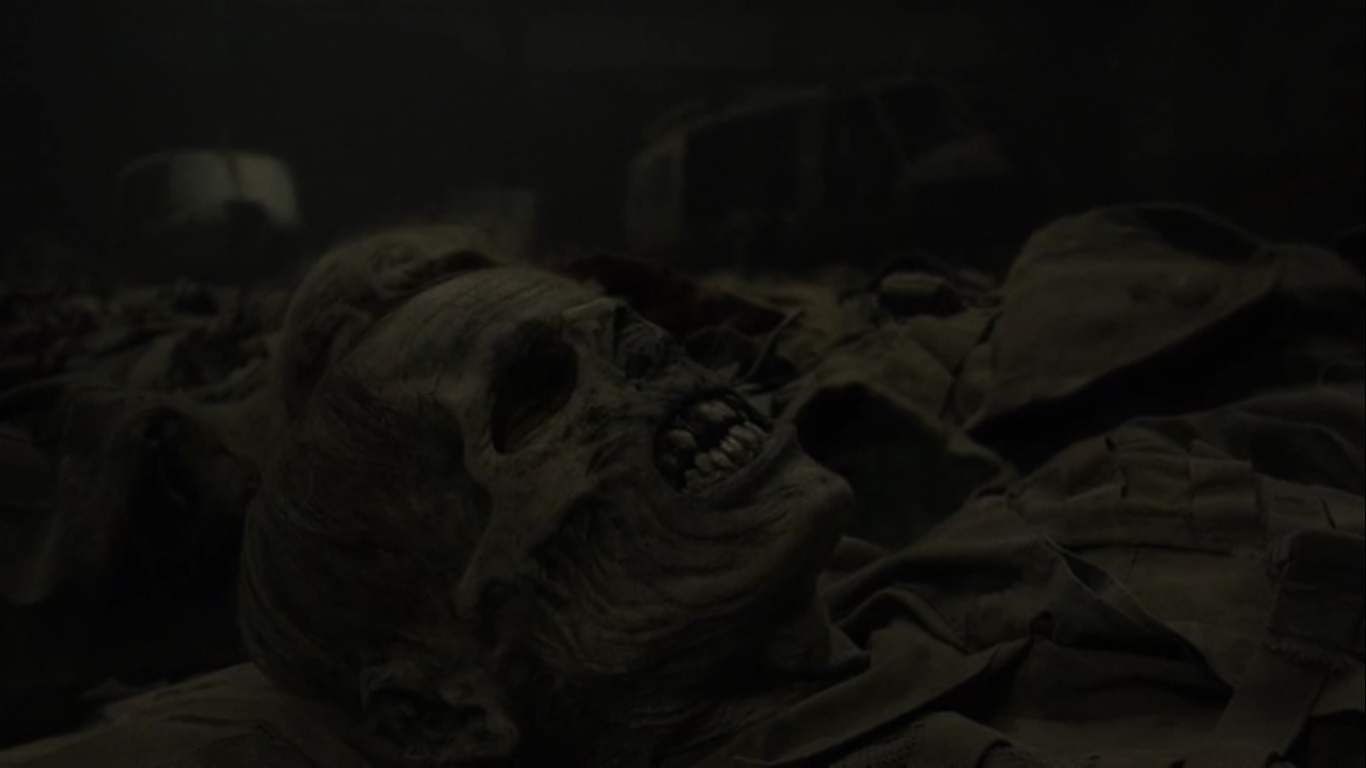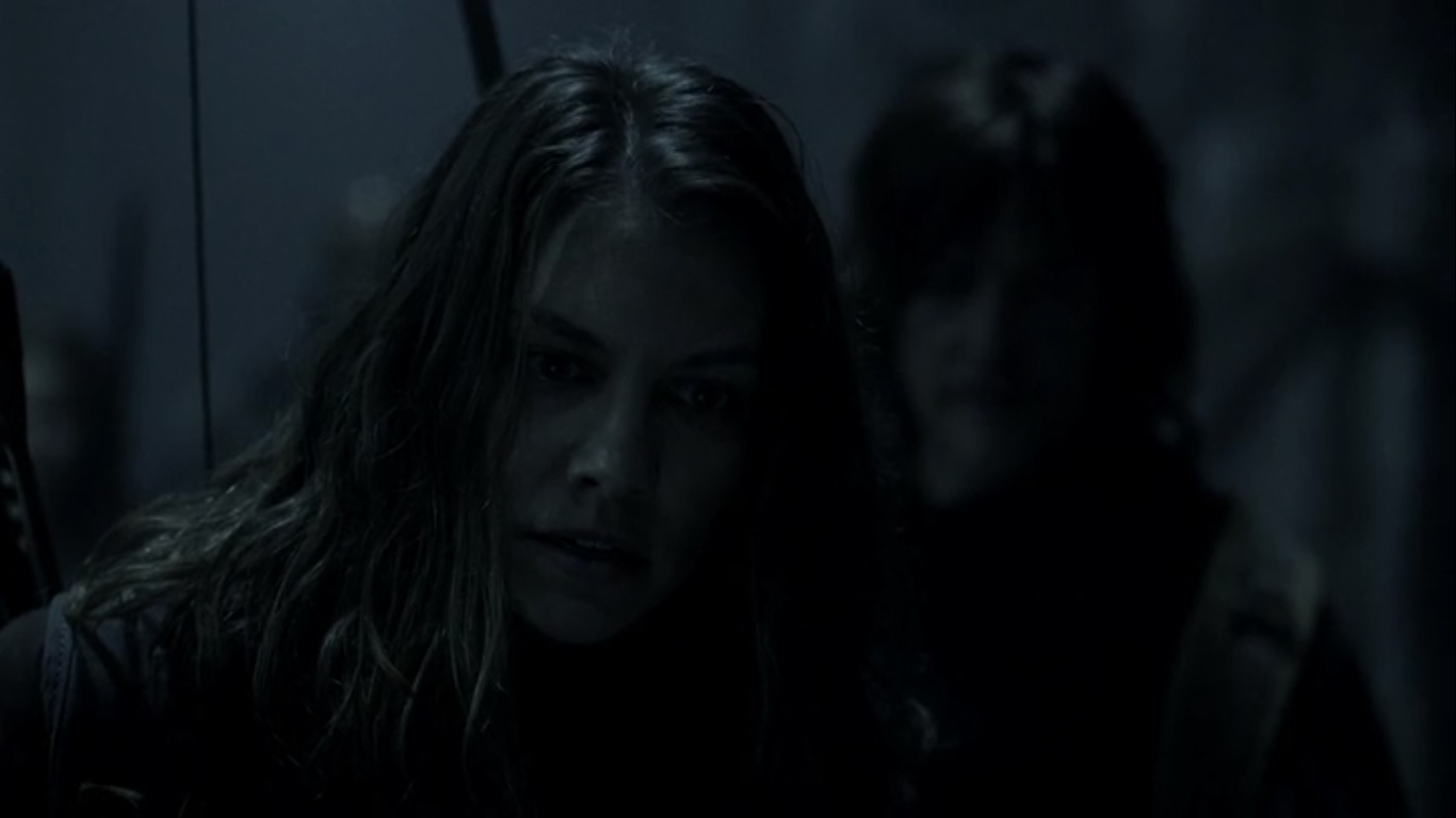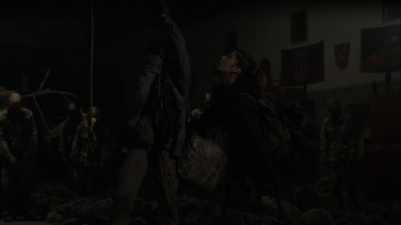 Back in the tunnels, the survivors happen upon an innumerable number of bodies wrapped in plastic. One comes to life as Daryl approaches it, but it doesn’t make a noise. After Daryl puts it down, he sees that the walker’s throat had been cut deep enough to almost take off its head. Not the work of the people Maggie dealt with, though. These people were killed during the fall.